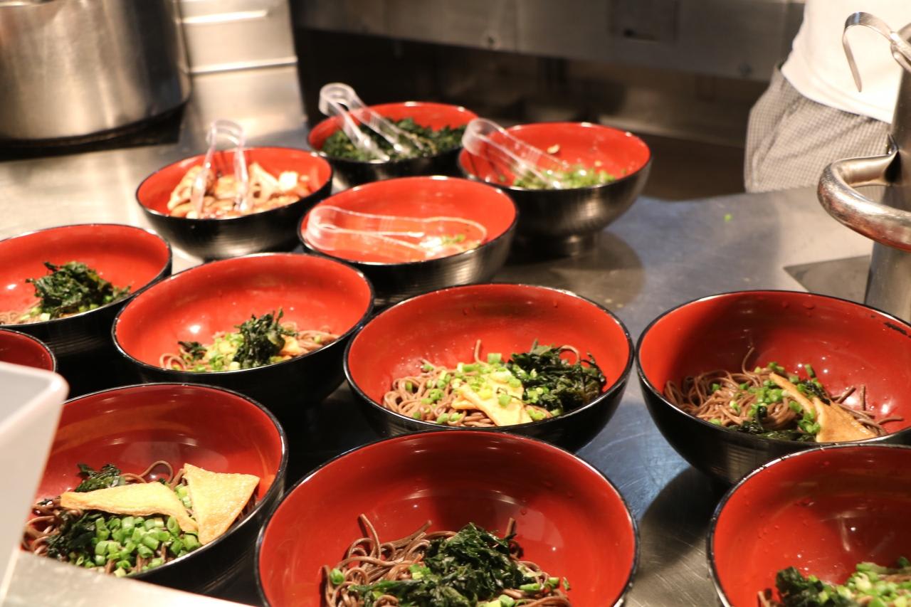 ショーを観た後は寝る前に蕎麦、ラーメンの夜食コーナーへ。明日の金沢観光に備えて寝る前に山菜そばを試食。調子に乗って食べ過ぎ!