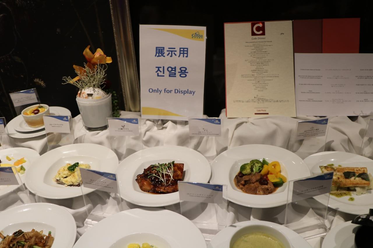 メインダイニングの入口には今晩提供されるメニューの見本が展示され、あとは食べたい物の番号を控えておきウエイターに注文すればよく、当たり外れがありません。(コスタクルーズの他にはない優れたサービス)