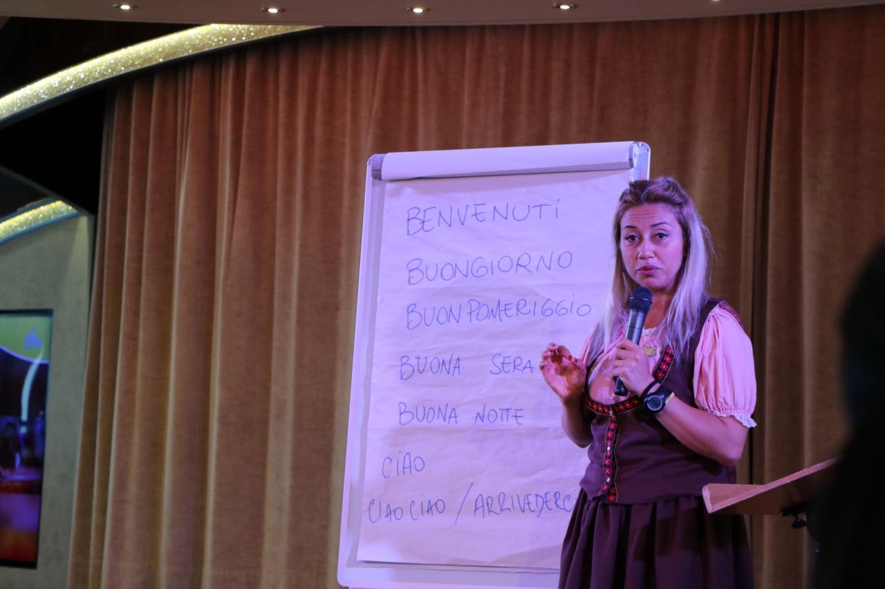 イタリア語教室教師はイタリア人のスタッフが務めるそしてラインダンスの時には先頭で先導役も務めるスーパーレディ