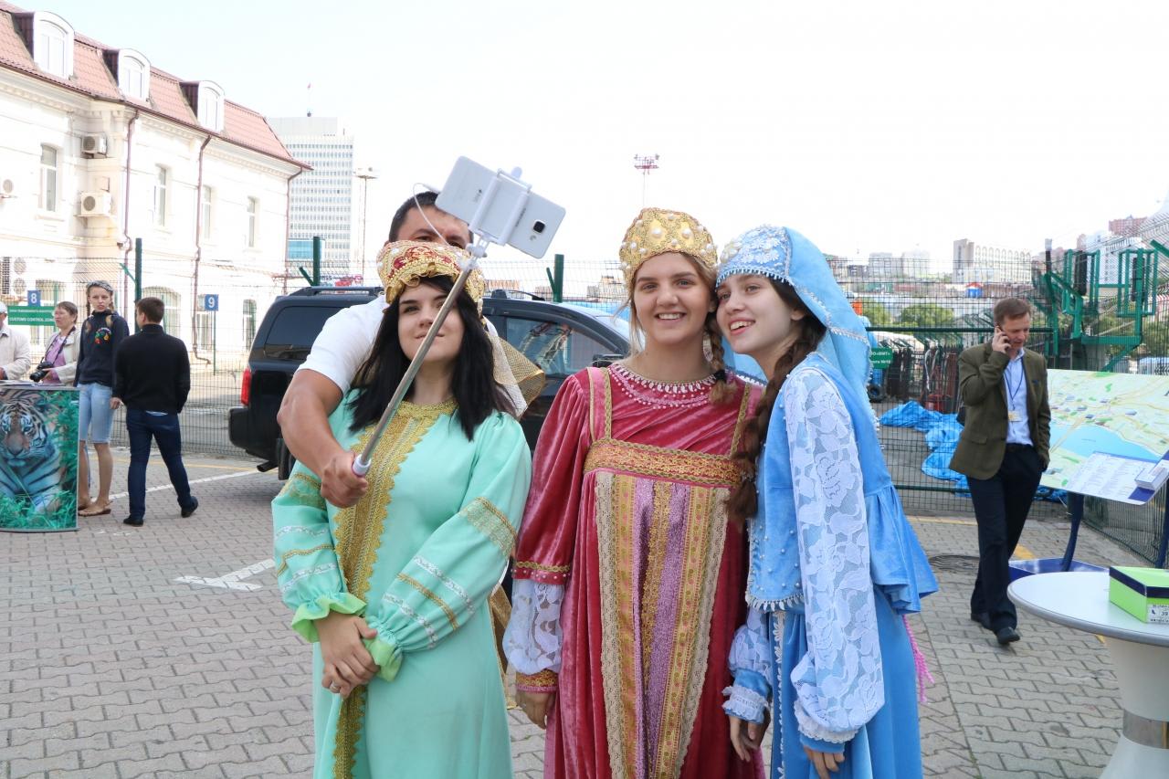 乗船客を歓迎というよりも自撮りを楽しむために訪れたウラジオストクの女性