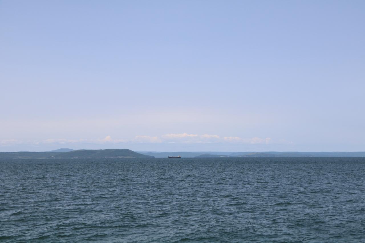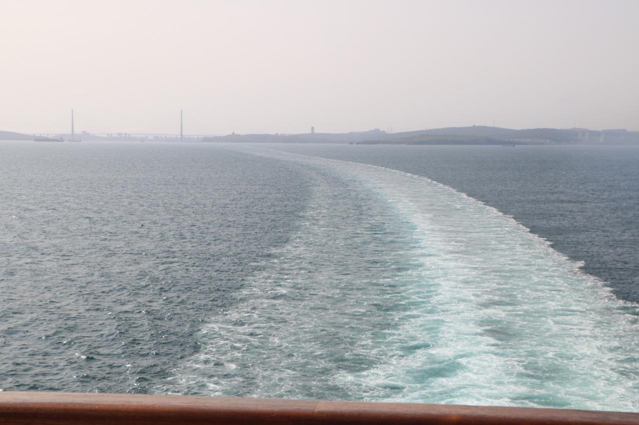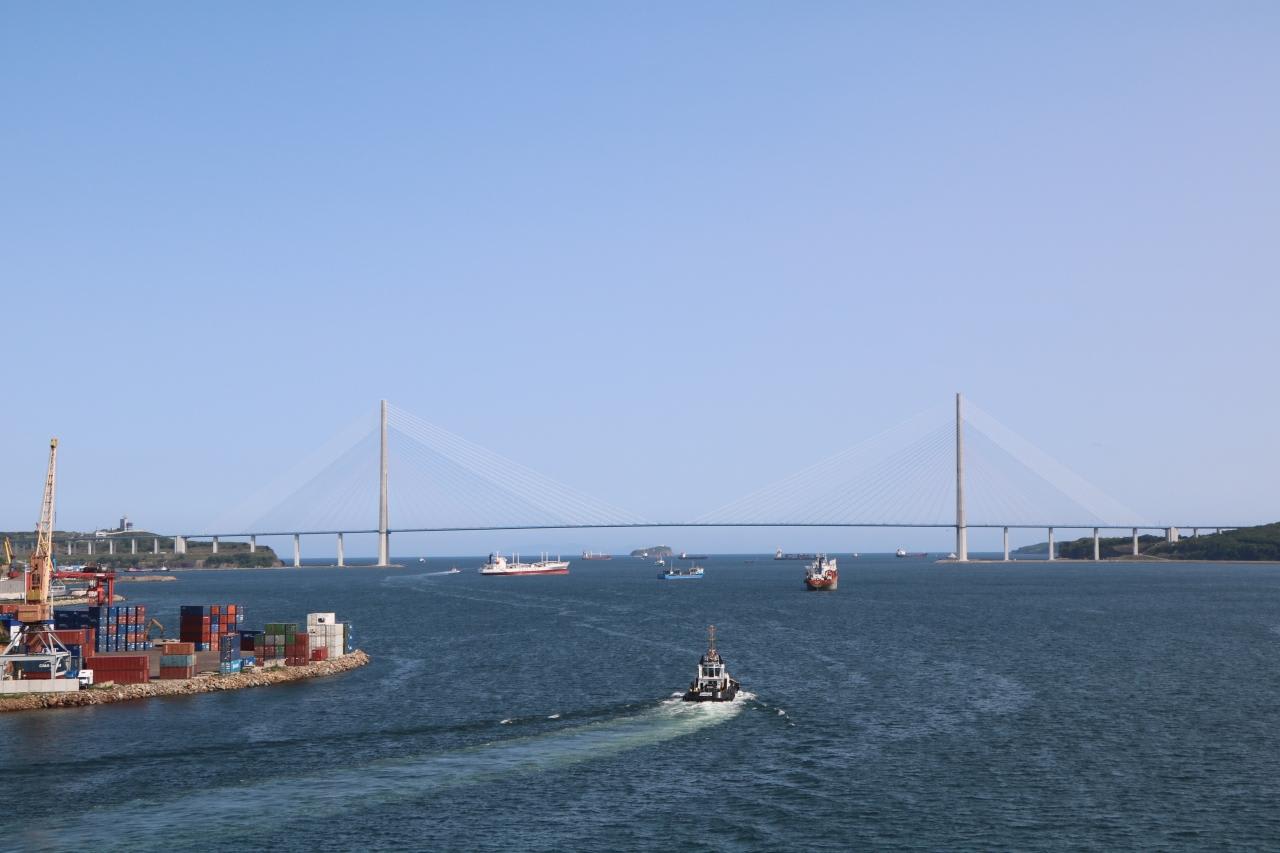 金角湾横断橋を潜った後は右に旋回し、次の寄港地・束草に向けて航行(ウラジオストク~束草間の航海距離630km)