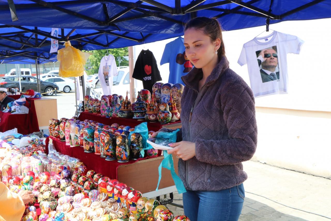 市内観光を終えてウラジオストク港に本船前には露天の土産物屋が営業チャーミングなロシア美人をパチリその奥にはプーチン大統領のTシャツ