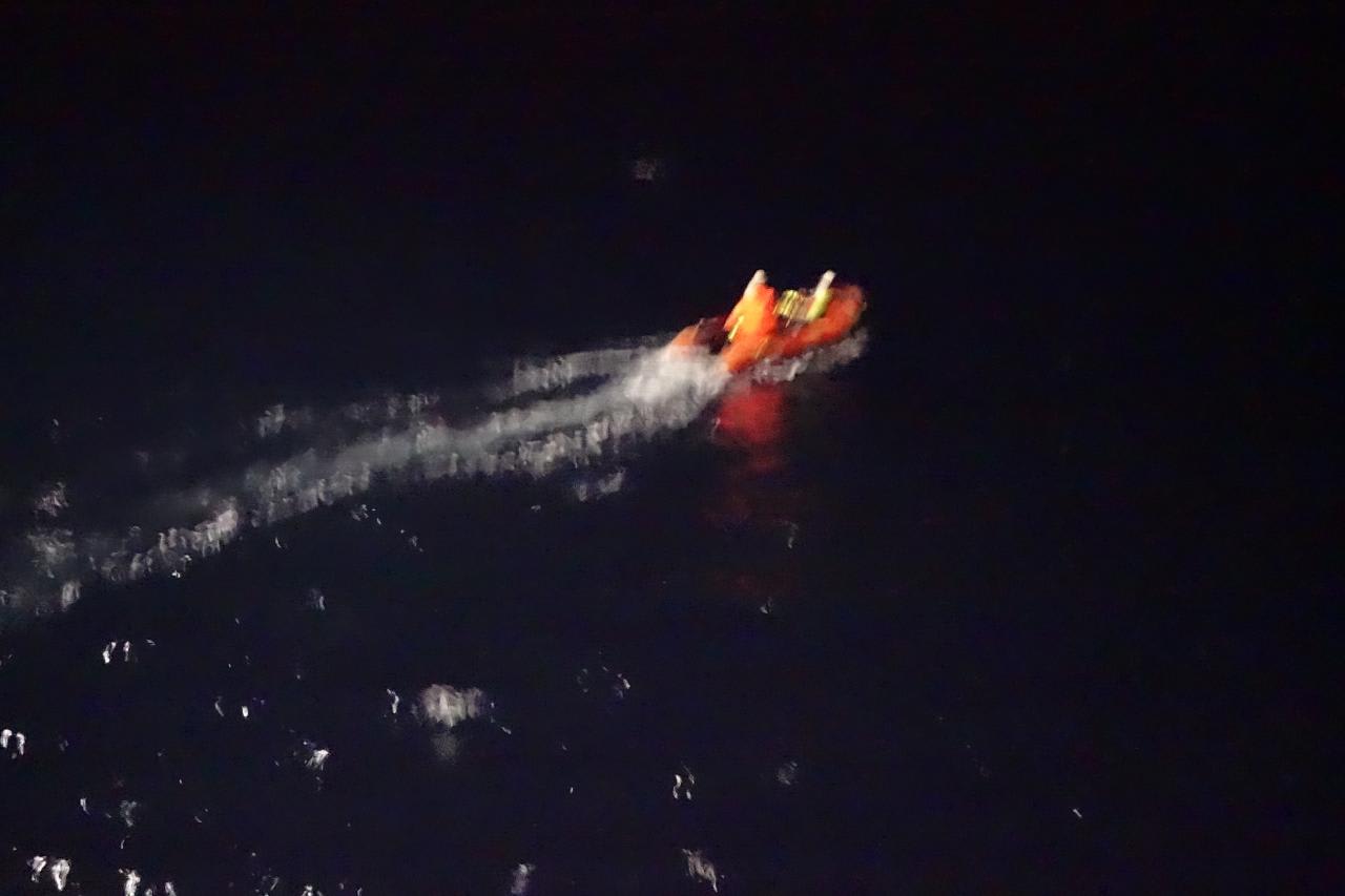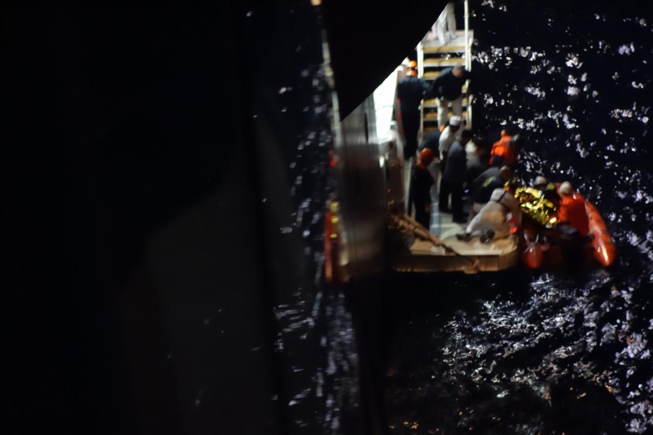 金アルミ箔に巻かれた急病人がゴムボートに搬出されました。
