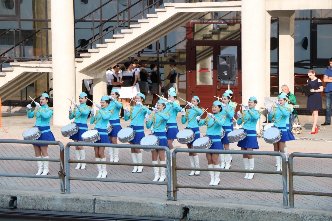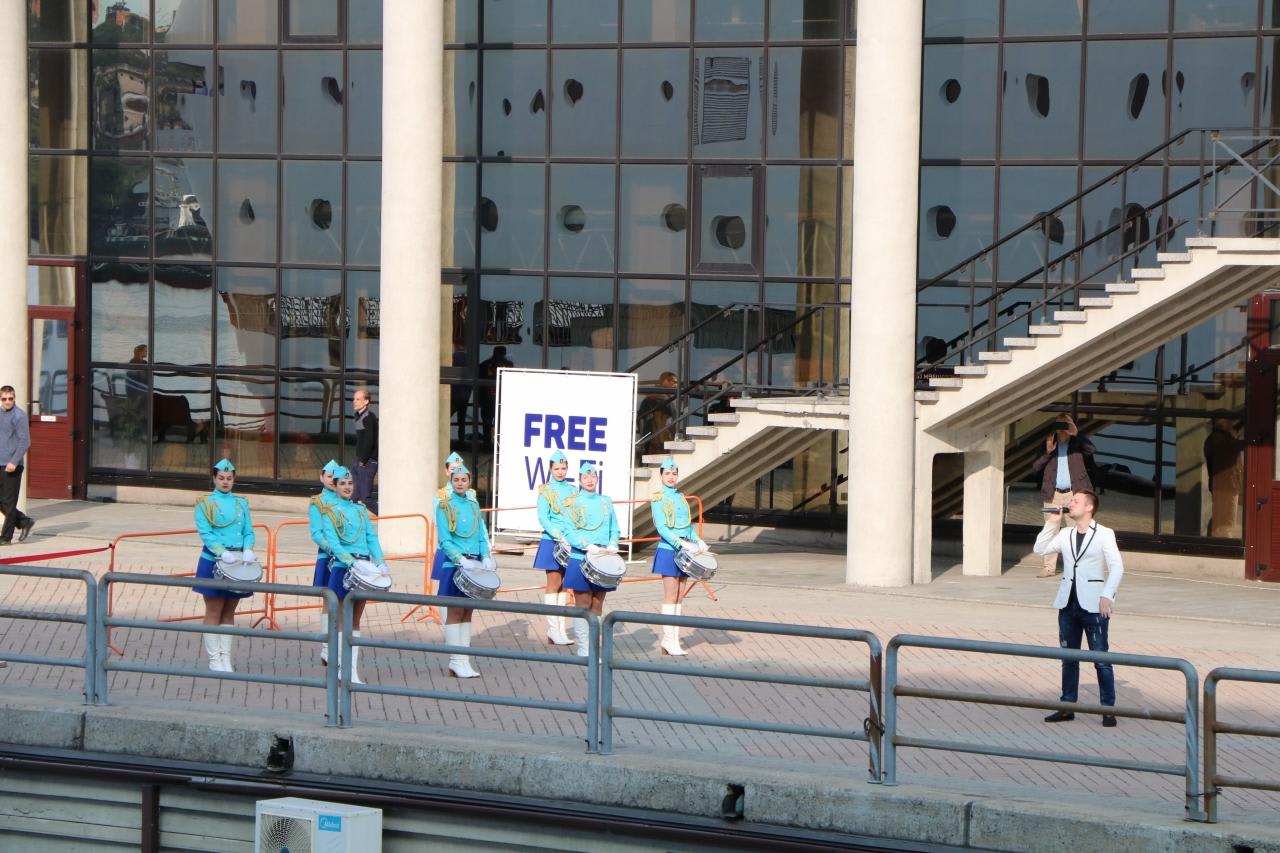 若い女性の鼓笛隊が演奏開始し歓迎セレモニーが始まりました。空色の制服が鮮やか!