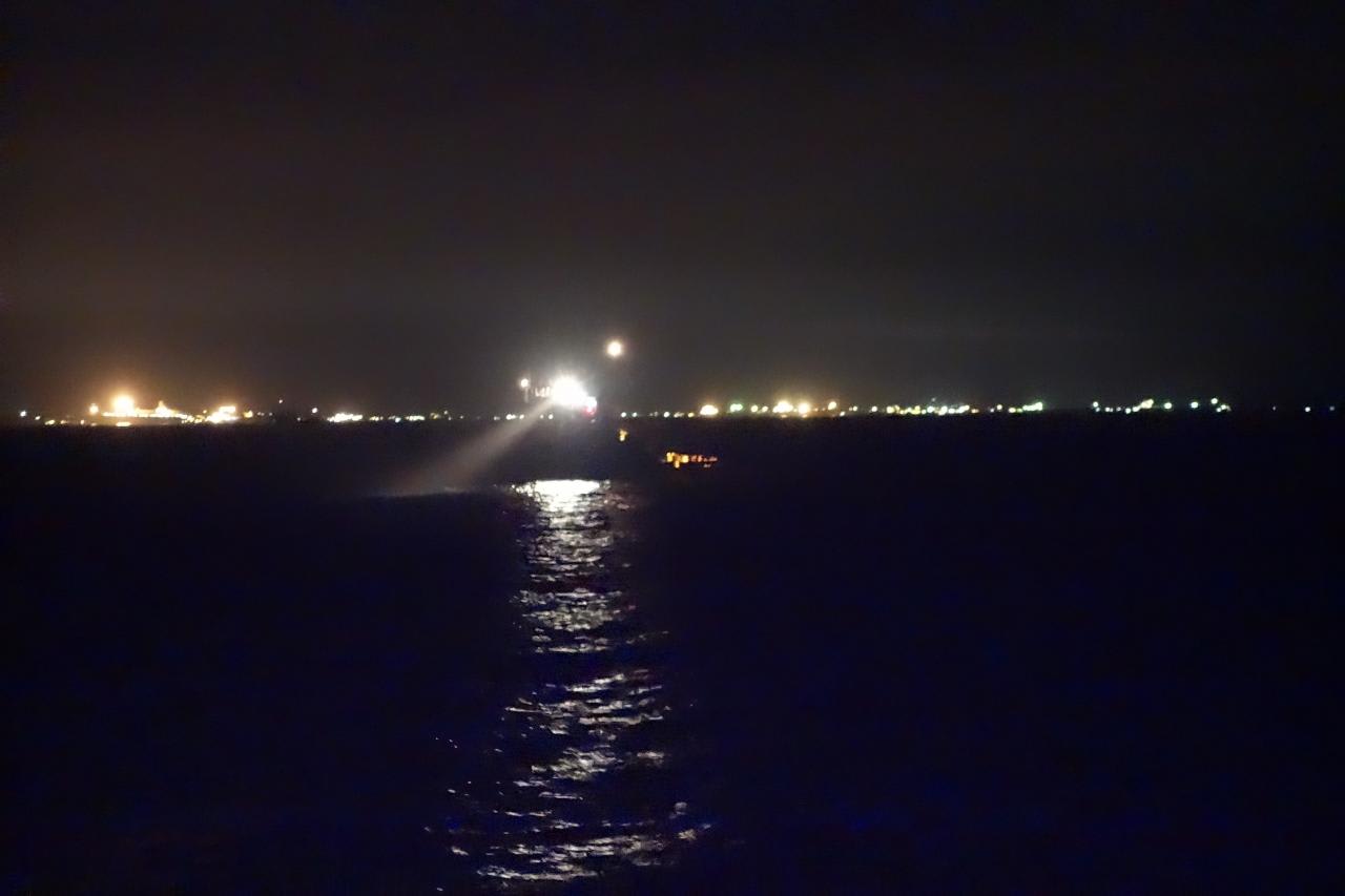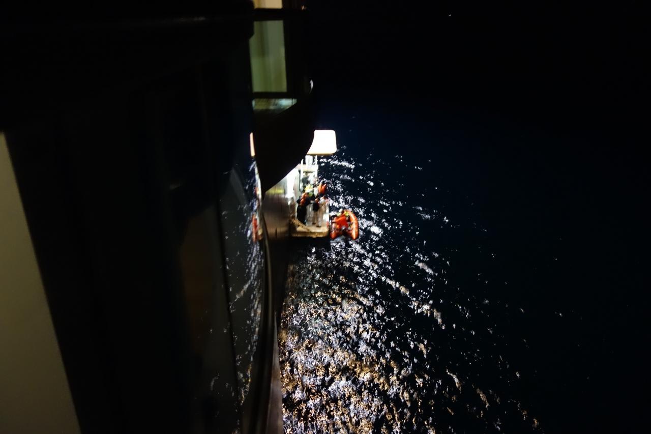 前日の終日航海日の午後3時頃、突然緊急連絡が船内放送でされました。『急病人が発生したので、今からナホトカ港に針路を変更し搬送するが、明日のウラジオストク到着時間は変更ないので、ご安心ください。』と船長からのメッセージ。*************************************終日航海日で海と空しか見えなかったのですが、午後10時頃ナホトカの町の灯りが見えて来ました。暫くして煌々とライトを照らしながらタグボートが近付いてきました。