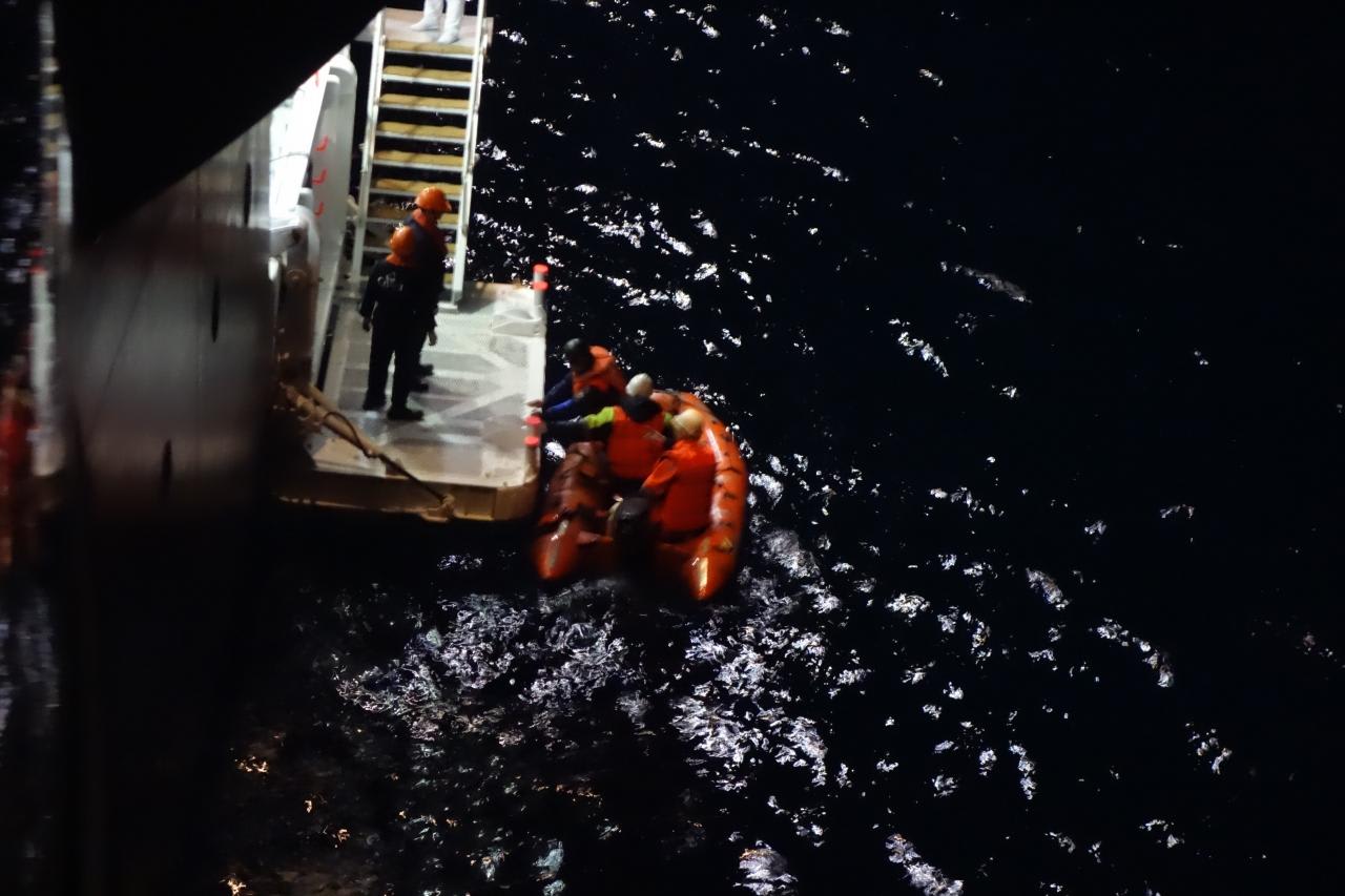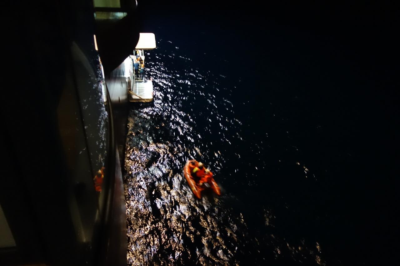 続いてタグボートからオレンジ色のゴムボートを降ろし、本船に近づいてきました。