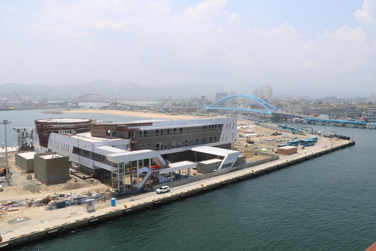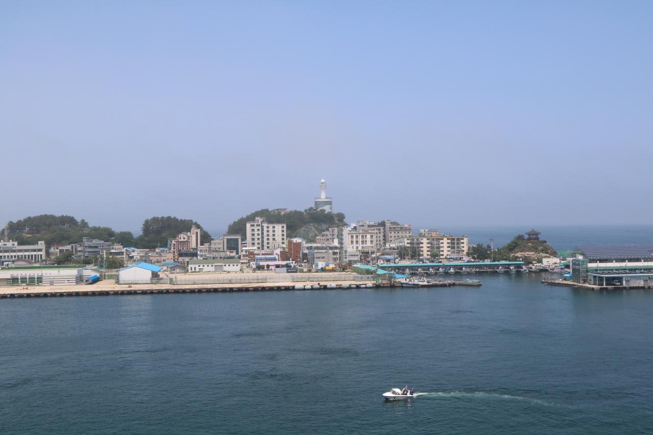 大韓民国の北端に位置する町なので田舎町と思いきや、本船が港に近づくにつれて近代的な高層ビルや建設中のクルーズターミナルが見えてきてビックリ。