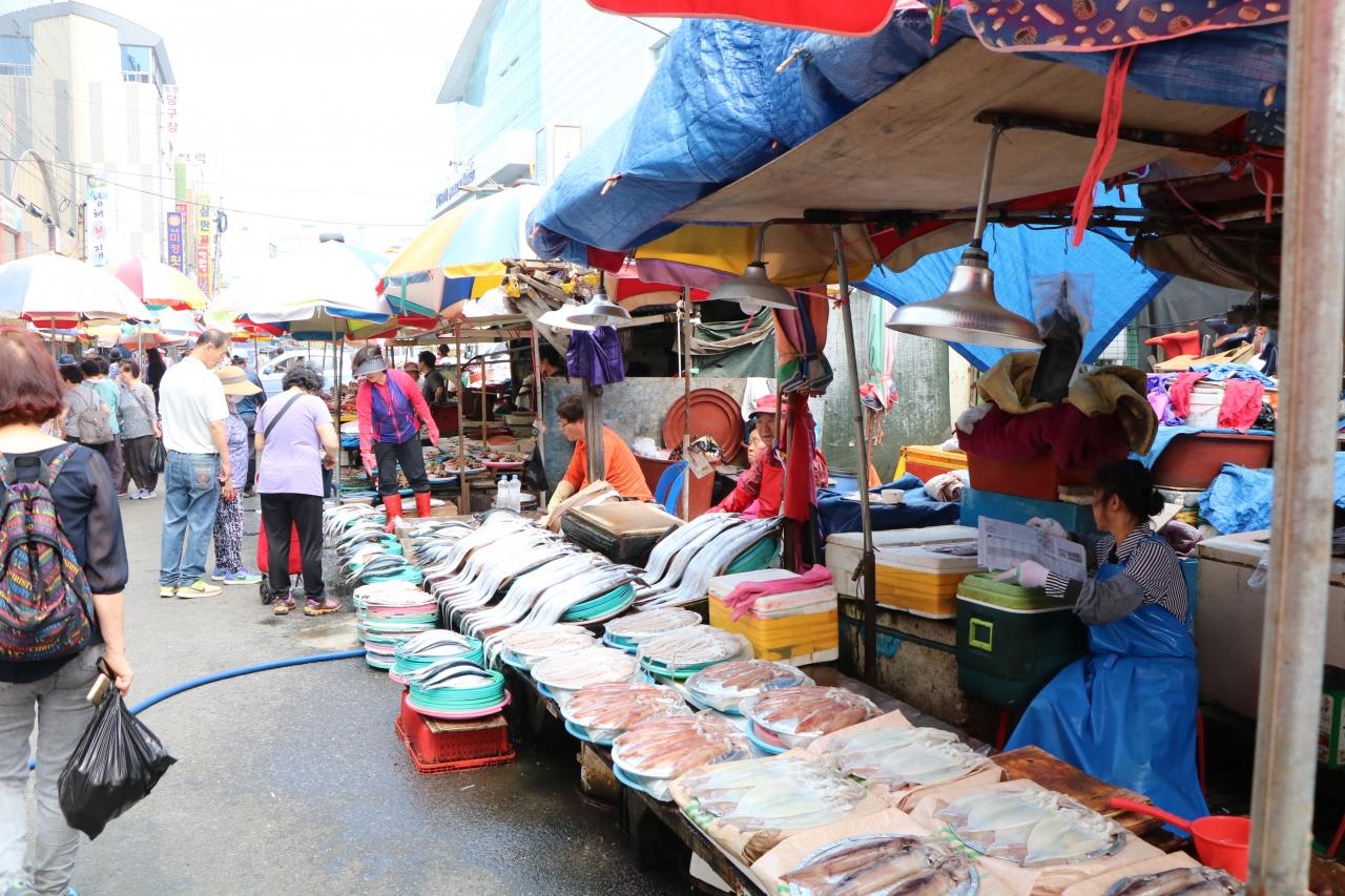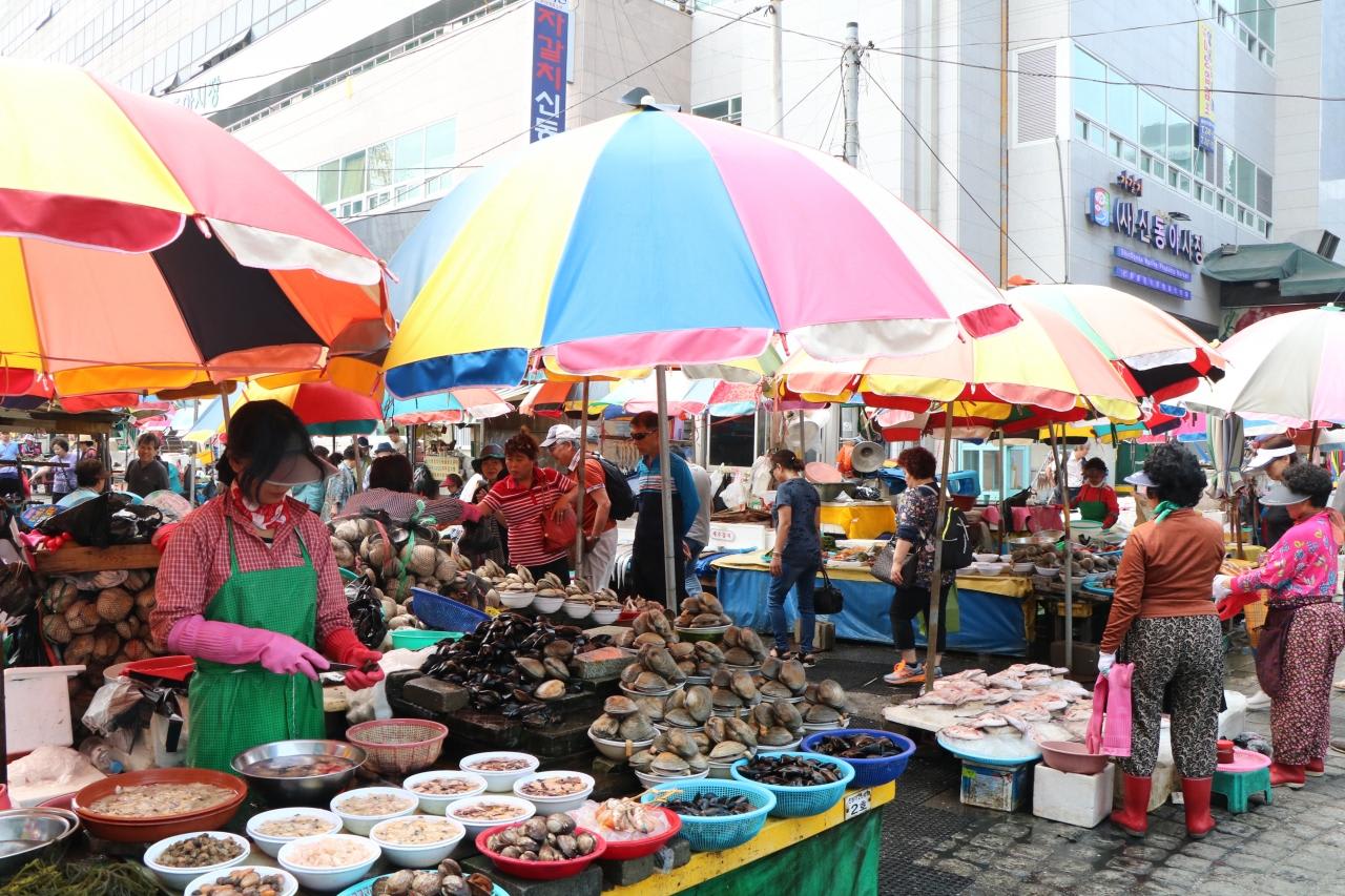 チヤガルチ市場場外には様々な海産物の店が建ち並ぶ