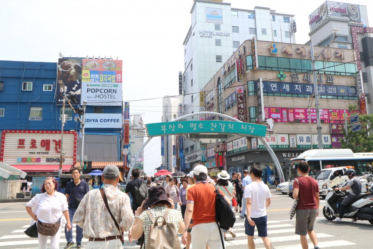釜山国際旅客ターミナルからタクシーに乗りチヤガルチ市場へチヤガルチ市場前の横断歩道
