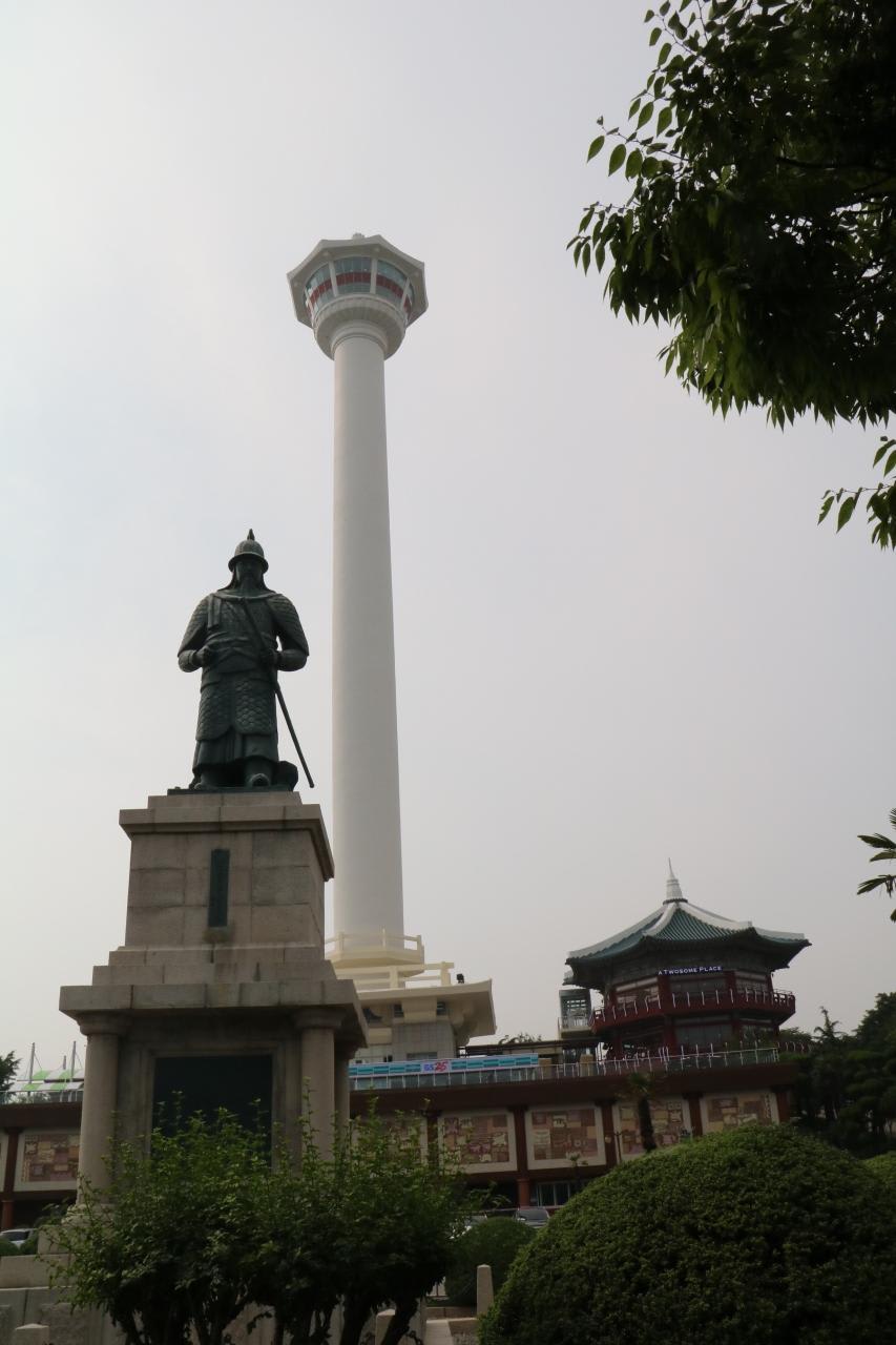 日本軍と戦った李氏朝鮮の英雄李舜臣将軍の銅像と釜山タワー