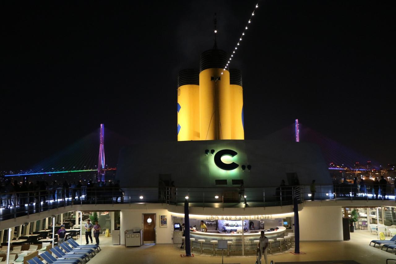 通常のクルーズなら夕方5時頃出港で夜景は見れません。今回は午後9時出港のお蔭で素晴らしい夜景が見られました。