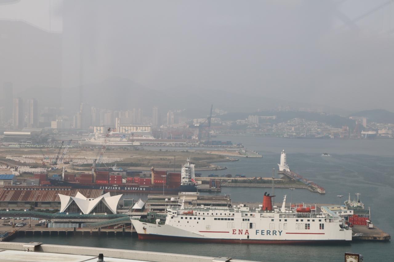 続いてロッテ百貨店光復店の屋上に昇り、釜山港を一望手前の船は釜山⇔済州島航路のENAフェリー奥の船は関釜フェリーはまゆうとコスタネオロマンチカ