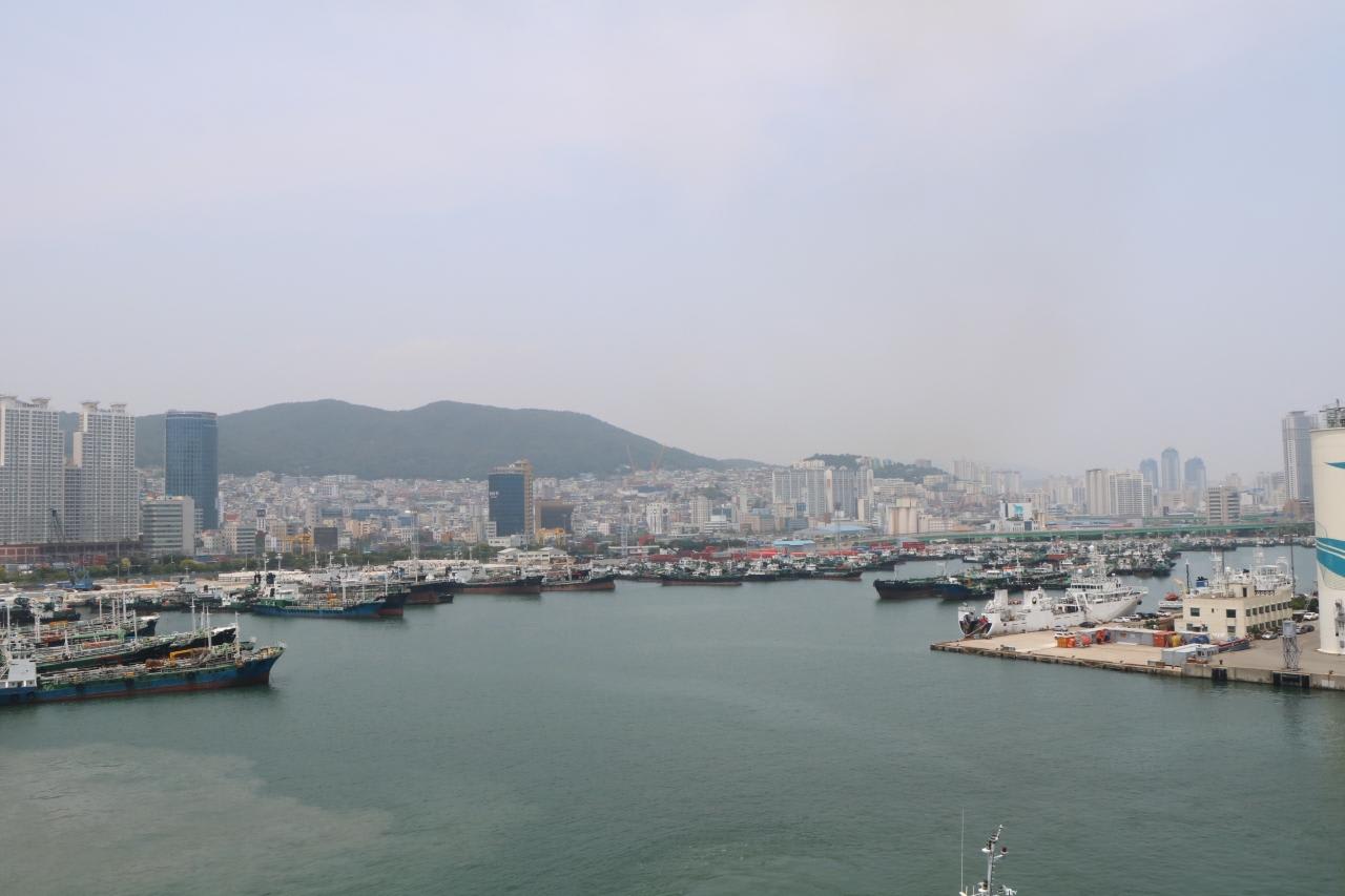 コンテナ、クレーンが林立するエリアを通り過ぎて、釜山港大橋を潜り釜山の中心部のビル群が近づいてきました。