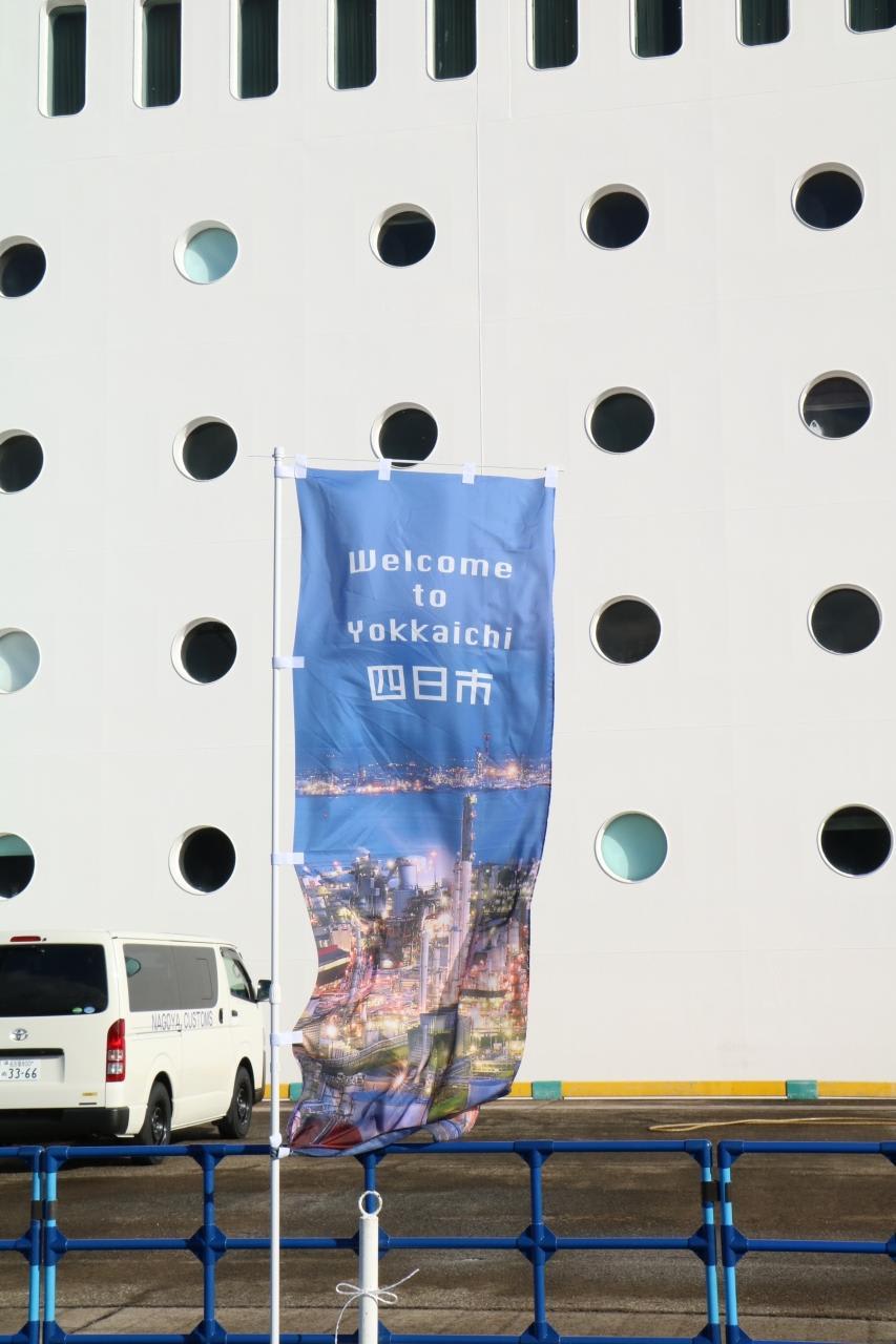 Welcome to Yokkaichiの旗四日市は客船誘致に情熱が注がれているのを感じました。