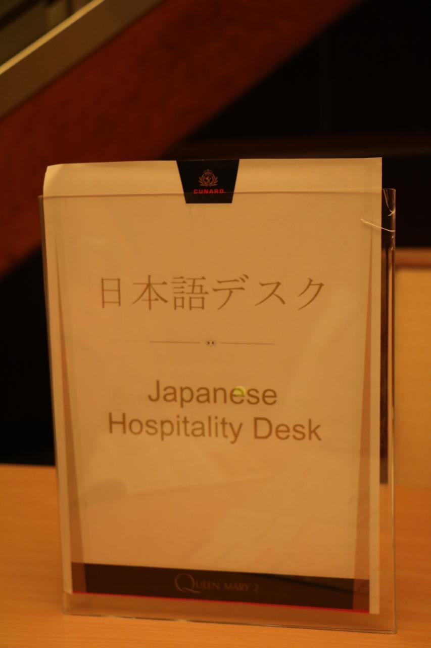 終日航海日にはデッキ2前方のコーナーで日本人乗船客を対象とした『日本語デスク』が設けられ、日本人ホステスが相談にのってくれます。今まで私が乗船した外国発着のクルーズでは日本人は他にいなかったため日本語デスクなどはなく、英語が達者でない者にとってはとても頼りになりました。