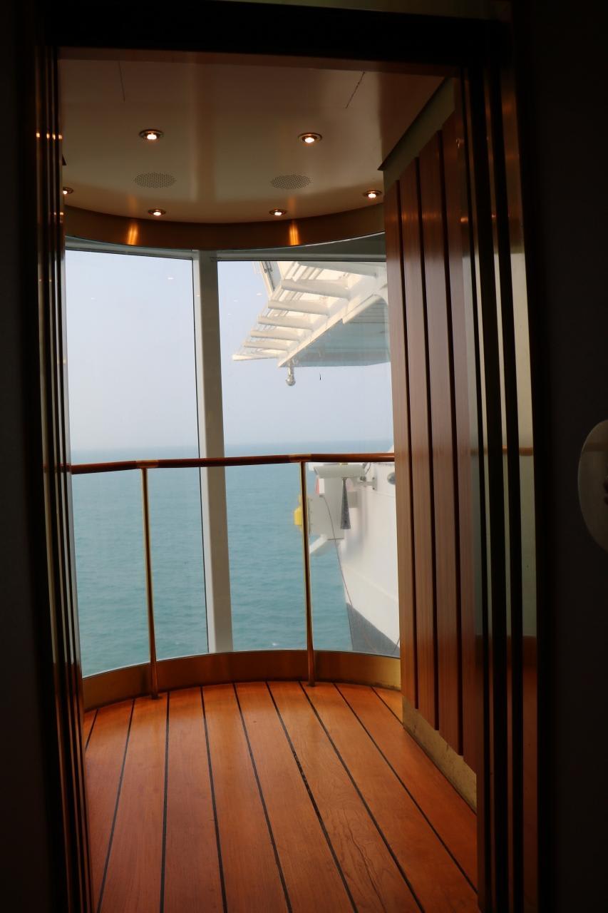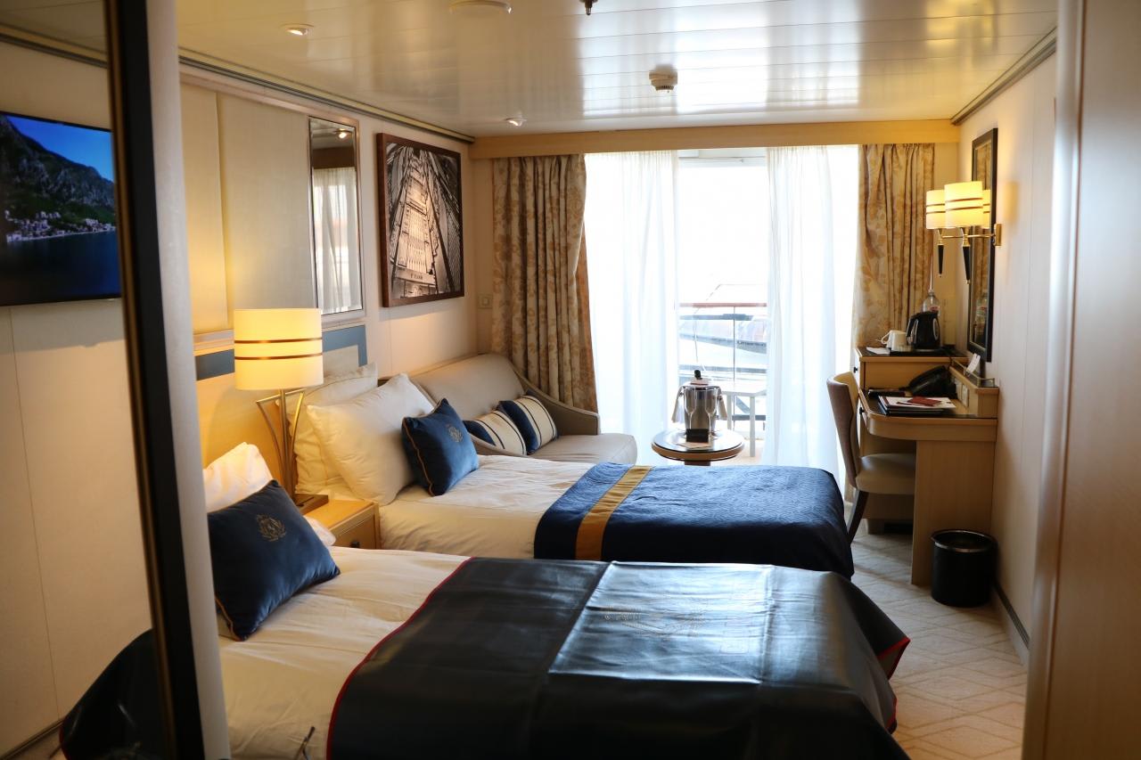 デッキ8の中央部に位置し、ベランダ付きで快適なマイキャビン。振動もなく海が荒れていても殆ど揺れず、船上にいる事を忘れそう。寝ている時に聞こえた音は推進軸の音ではなく空調の音でしょうか?