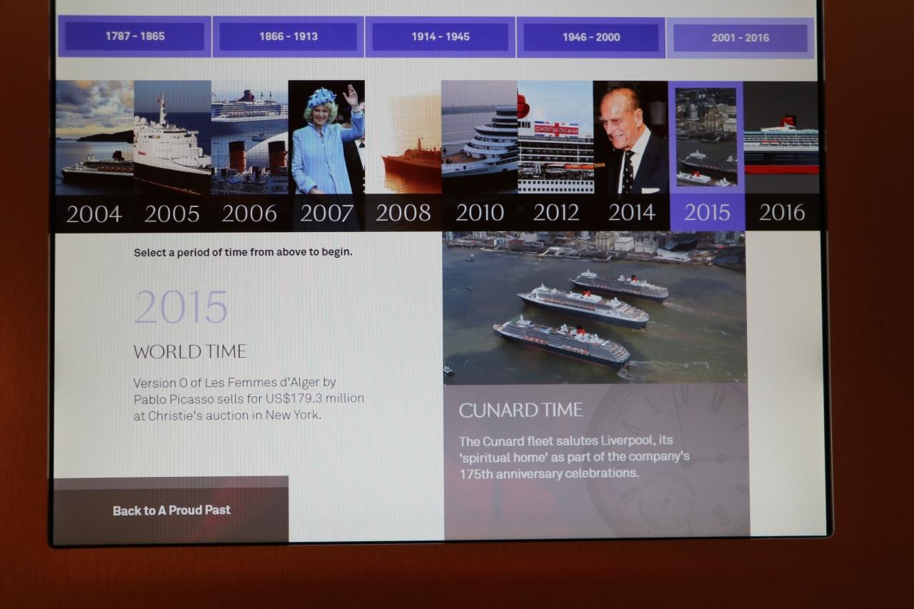 デッキ2船首にあるキュナード社の歴史を物語る史料コーナータッチパネル形式で色々と検索。