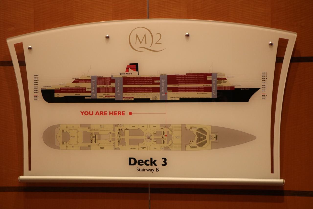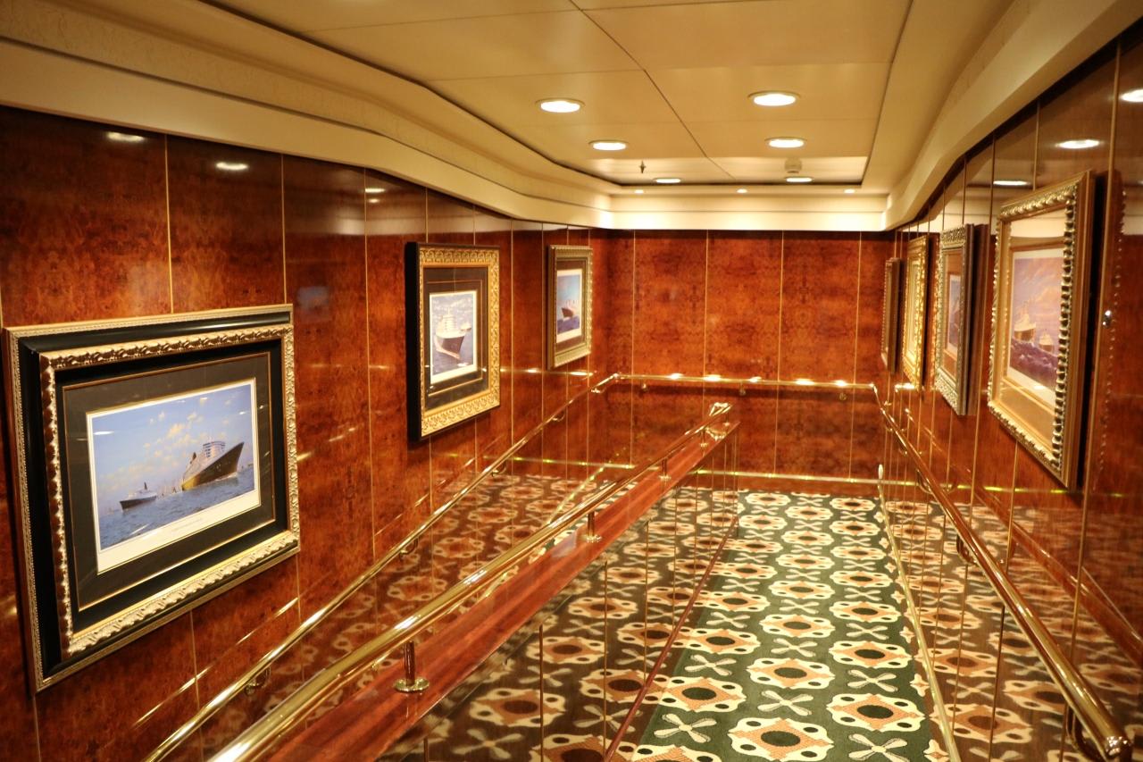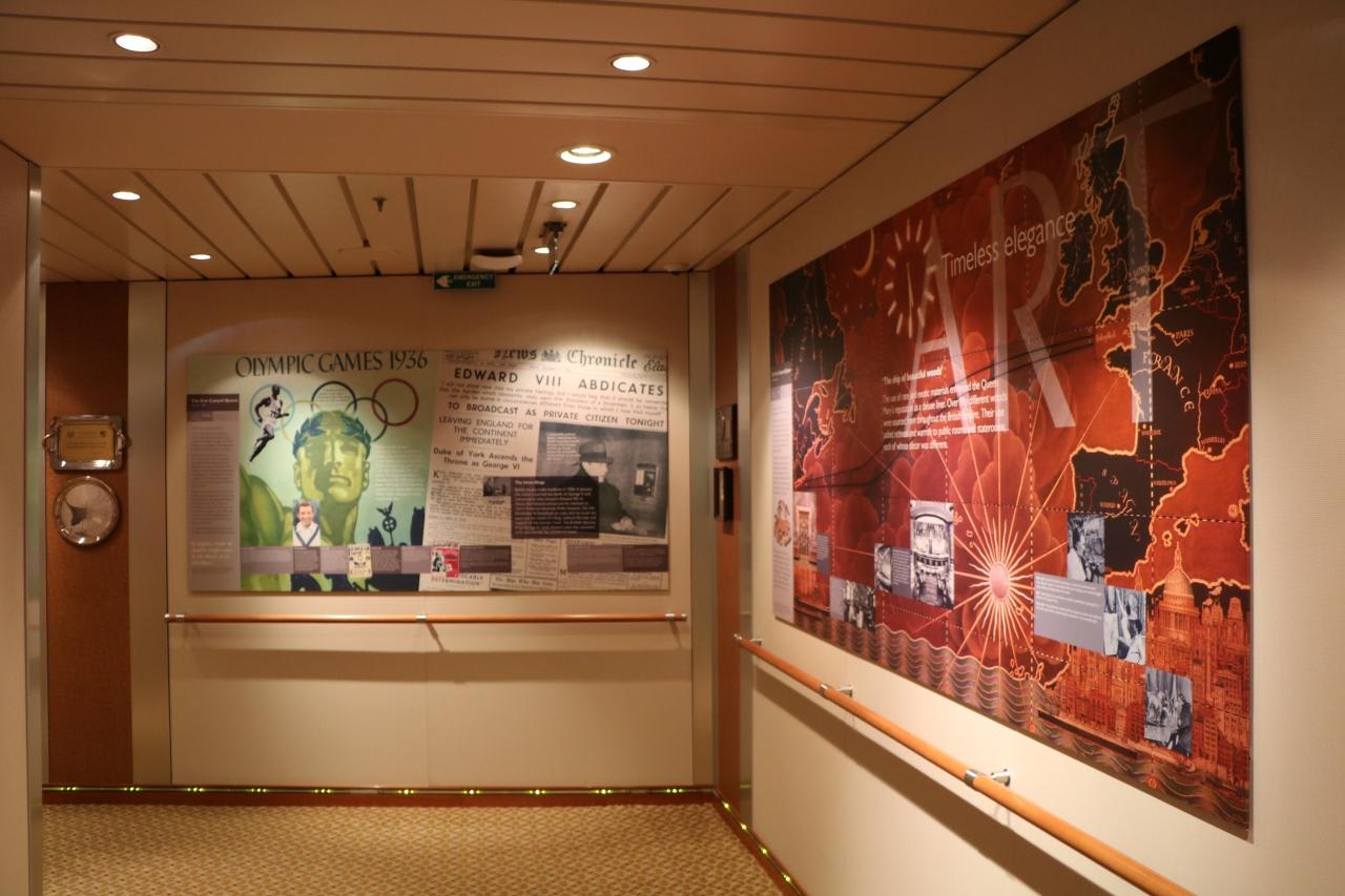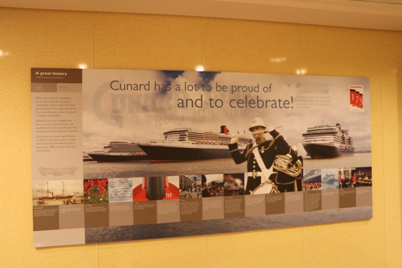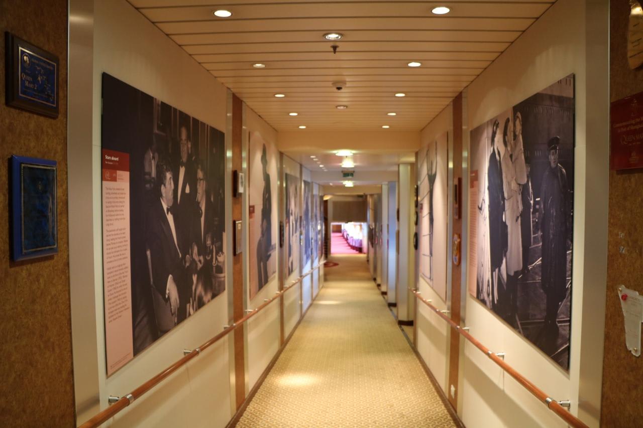 デッキ7後方の廊下にキュナード175周年記念の象徴としてQE・QM2・QV3隻が並んだ写真を掲示時を超え人々に愛され続けているキュナードの歴史と伝統を感じます。