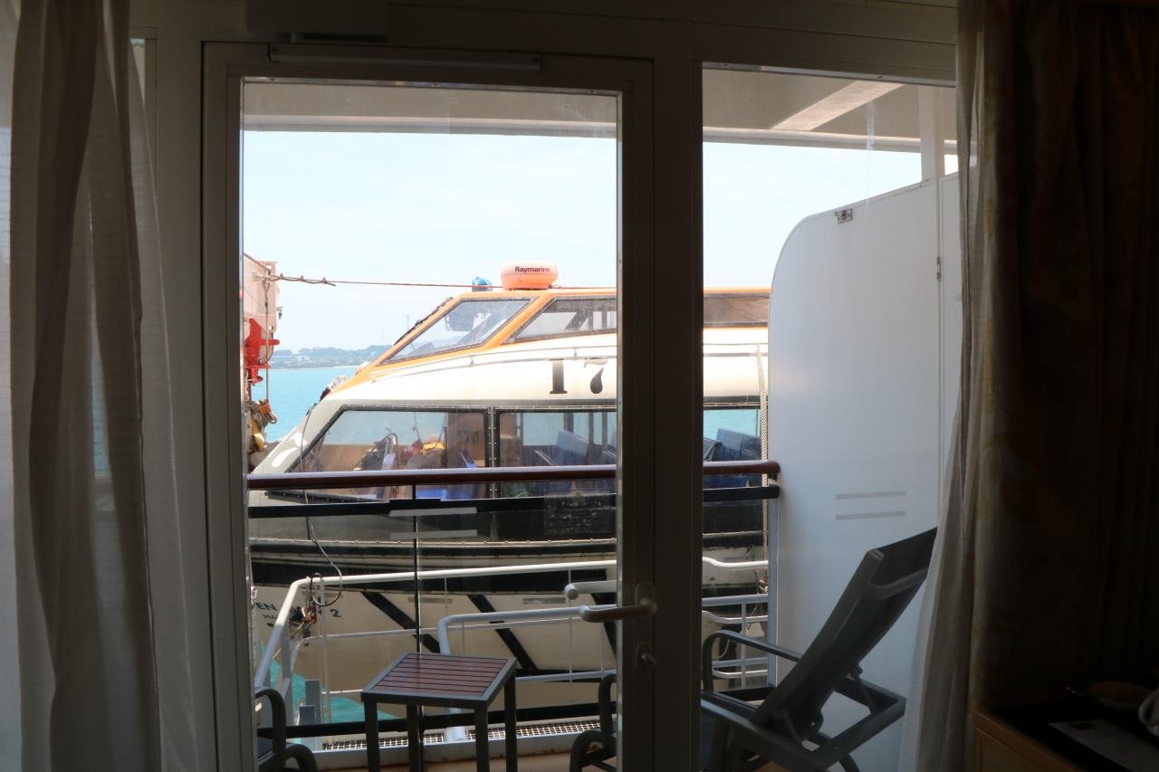 ご覧のようにベランダの向うには救命艇が視界を遮っています。バスタブはありませんが、ベランダ付きでお値打ちなグレードです。