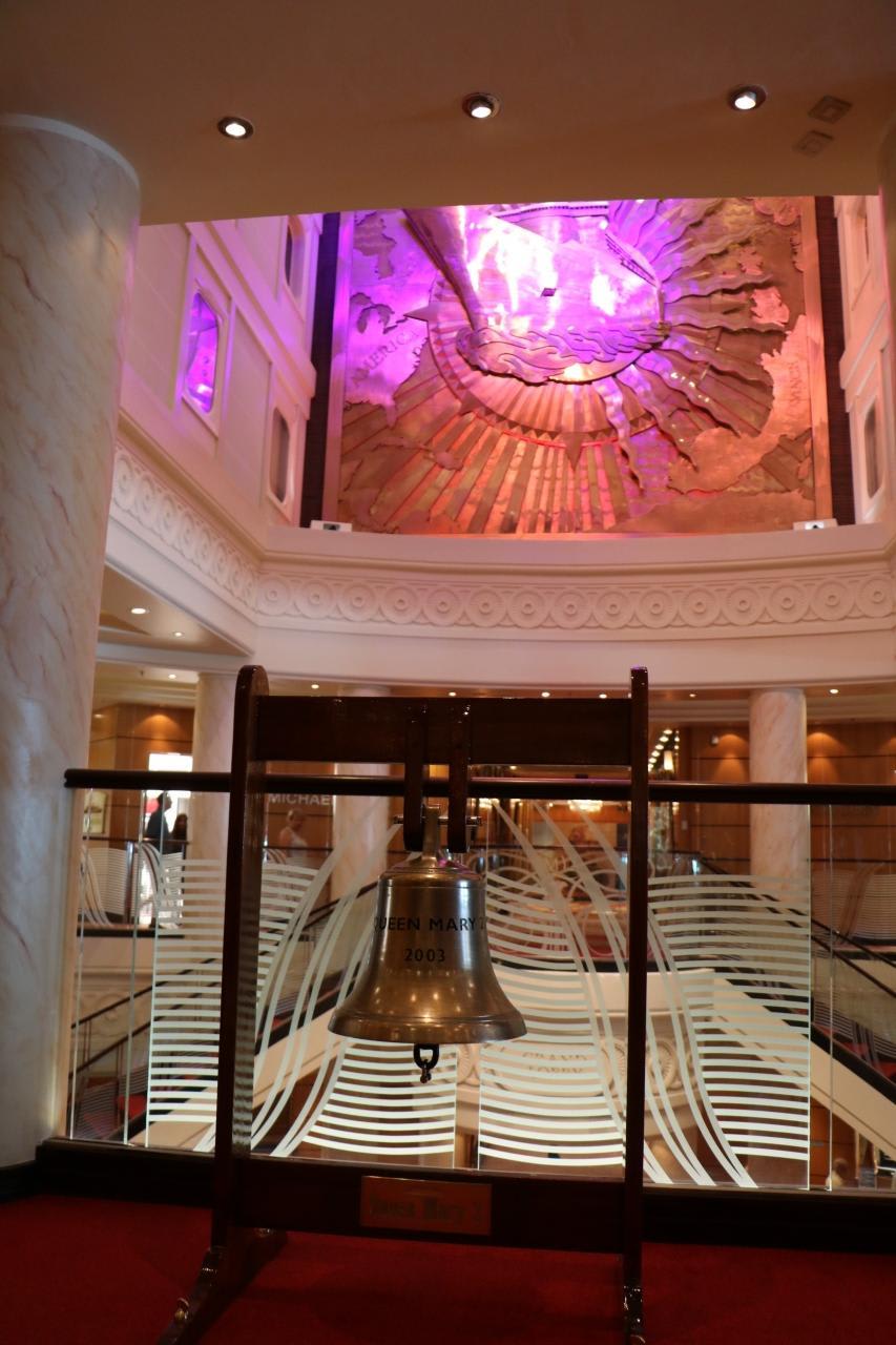 デッキ3のアトリウムに設置の鐘とクイーンメリーの壁画