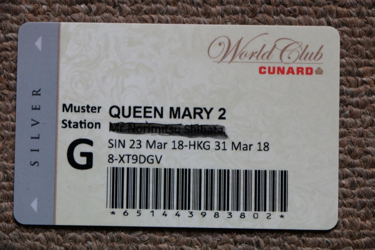キャビンの鍵・船内での精算用クレジットカード・身分証明の3つの役割を果たすクルーズカード(IDカード)私はシルバー会員:27年前の1991年にQE2に乗船した乗船券原本がバウチャーとして認められ、キュナード・ワールドクラブ(リピーター登録)上は2回目の乗船。次回乗船するとゴールド会員に昇格します。