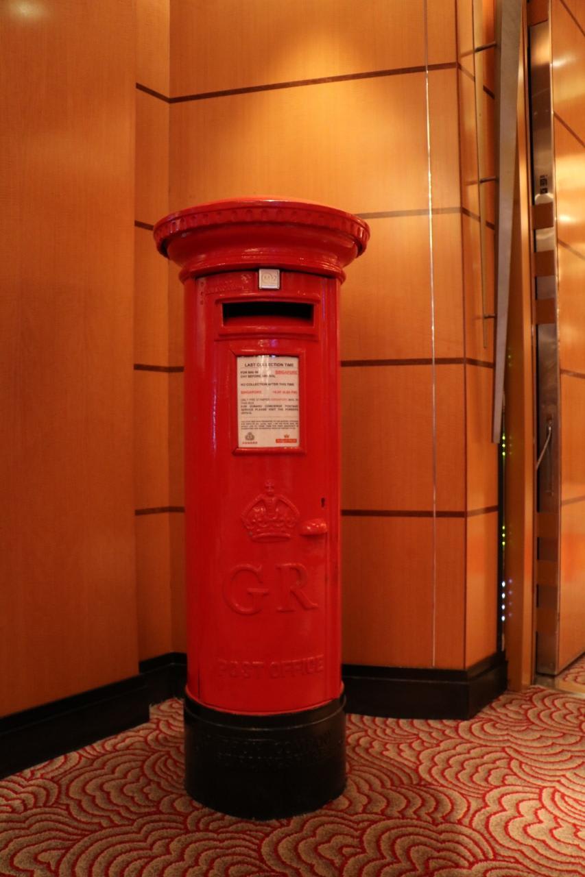 クイーンメリー2の艦船接頭辞RMS(Royal Mail Steamer英国郵便汽船)が物語るデッキ2ロビー設置の赤い郵便ポスト絵葉書や定型サイズの手紙を1枚につき$1.60で世界中に送れる。(投函した後の寄港地から発送)