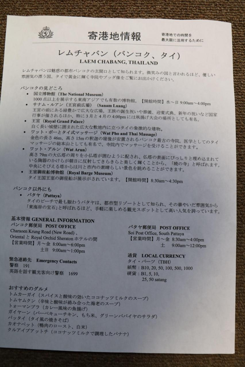 今回のシンガポール出港時点での乗船客数は41ヶ国の2,554名。国籍上位はオーストラリア人が1,118名、2位がイギリス人548名、3位がアメリカ人249名、4位が何と日本人123名。日本人もやっとクルーズの魅力が分かってきてクルーズ愛好家が着実に増えていると感じました。