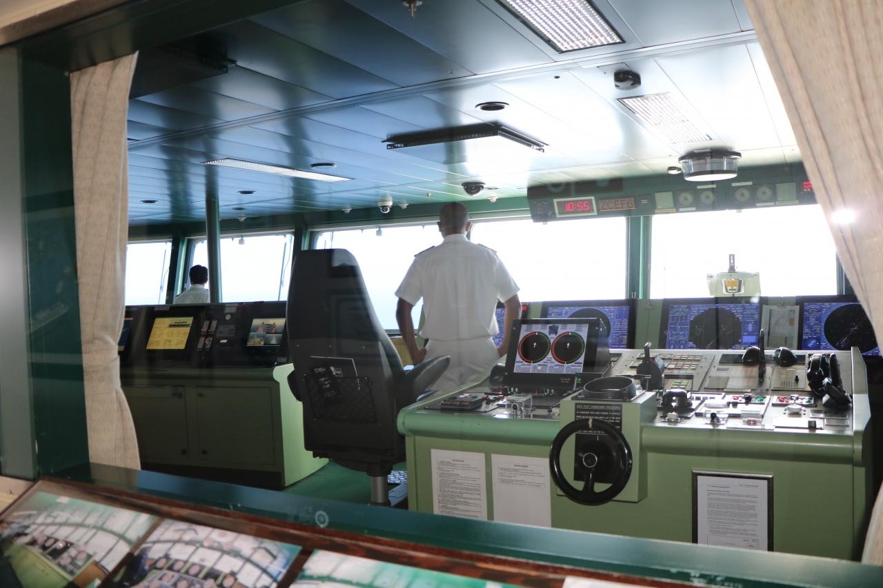 ブリッジ(操舵室)を後方から見学できるコーナー(デッキ12)
