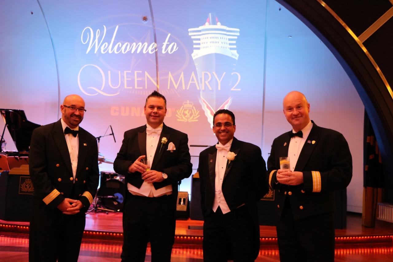 フォーマルナイトに行われたカクテルパーティーで愛嬌をふりまく上級オフィサー。インフォーマル化の趨勢の中でキュナードはフォーマルナイトでは頑なに正装を求めているようです。