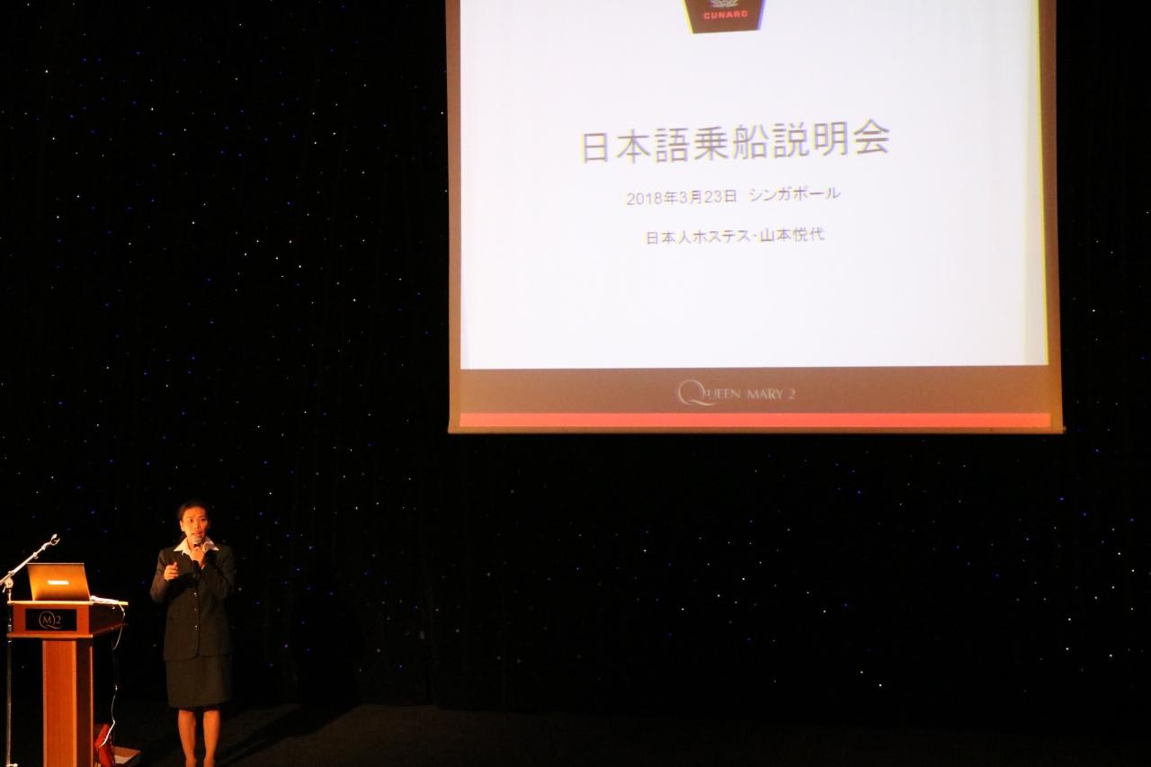 本船には日本人ホステスが乗務しており、乗船日の午後4時から日本語による乗船説明会と避難訓練が行われました。クイーンメリー2の大西洋航路に何度も乗務し、最終目的地サウザンプトンまで乗務する日本人ホステス山本さんにより船内生活で役立つ情報や注意事項が分かりやすく詳細に説明され、とても参考になりました。