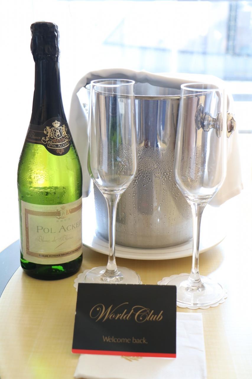 キュナード社のリピーターであることからキャビンのテーブルにはスパークリングワインがプレゼントされていました。