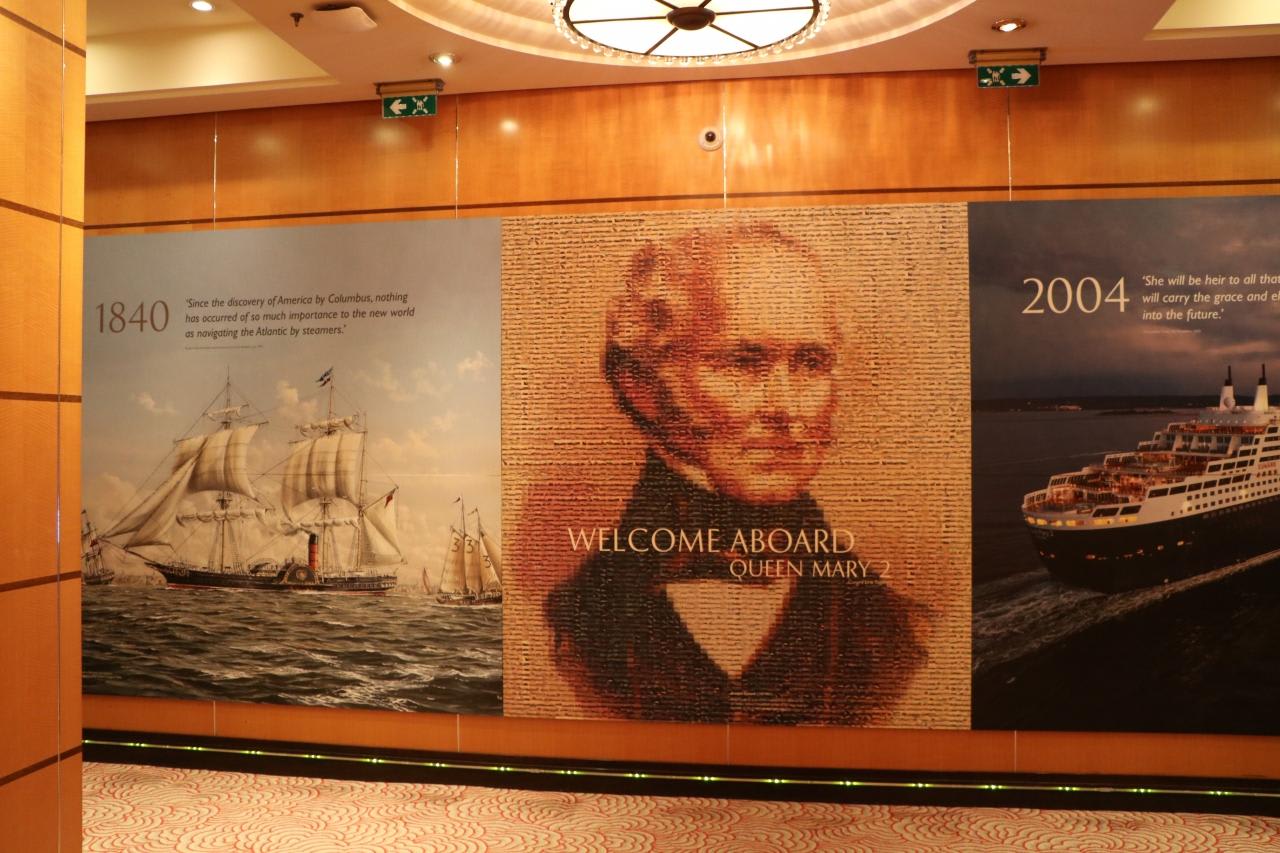 真ん中の肖像はキュナード社の創設者サミュエル・キュナード。1839年イギリス政府の郵便補助航路企業として、「イギリス及び北アメリカ郵便逓送特許汽船会社(British and North American Royal Mail Stamp Packet Co.)」を設立。左側はキュナード社の記念すべき最初のブリタニア号、右側は2004年に就航したQM2。