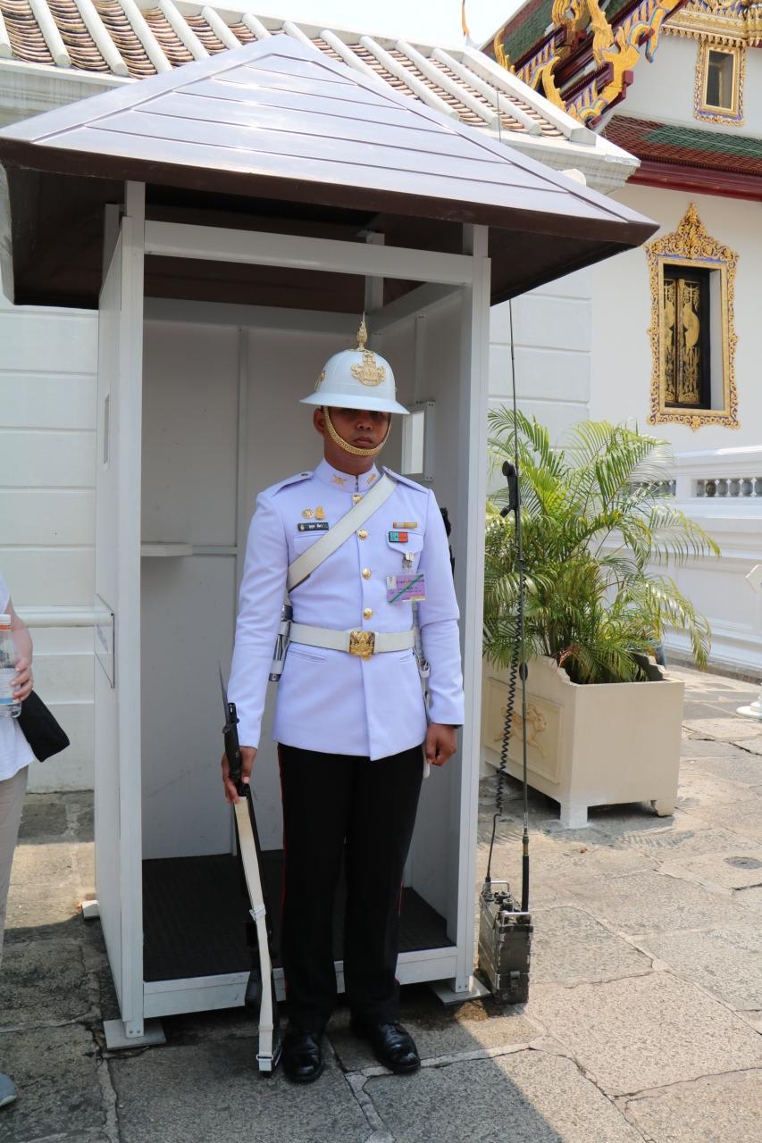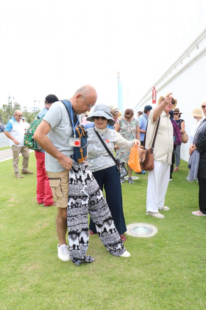 王宮は王室の施設なのでノースリーブやタンクトップ、半ズボンなどでの入場不可。バンコクは暑い所なので当然ながら入場禁止となる人も多いので、手回し良く象の絵模様の長ズボンを貸してくれていました。