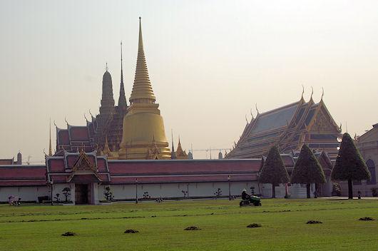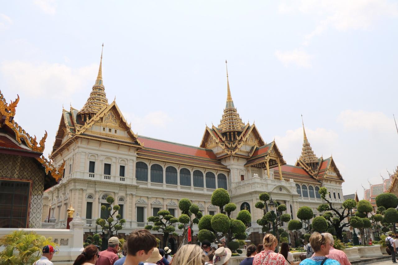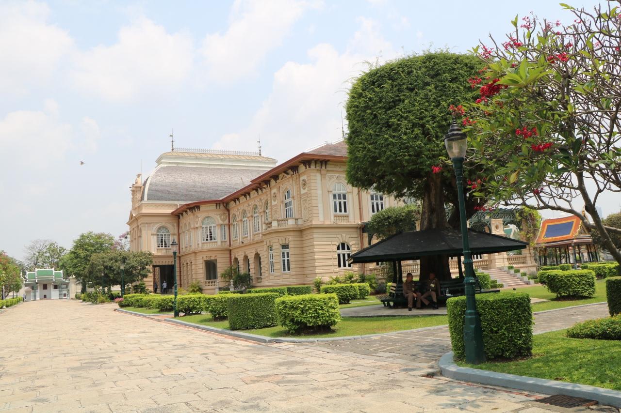 3階建のチャクリー・マハー・プラサート宮殿先代のラーマ8世まではここに住んでいたらしい。西洋のルネッサンス方式とタイの伝統的な建築様式が合わさったこの建物は19世紀末の完成。壁・窓などはルネッサンス様式、屋根や尖塔がタイ様式。
