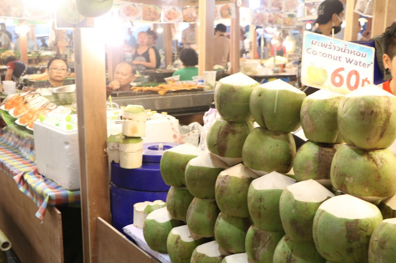 ココナッツをカットして飲むココナッツウオーター(60B・約200円)