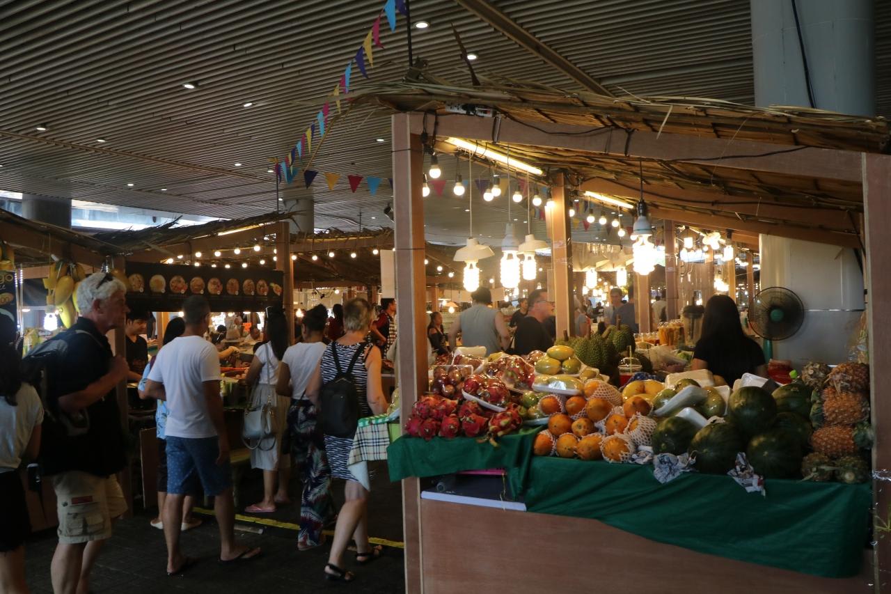 王宮を観光した後、バスは30分程走りMBKセンター(マーブンクロンセンター)という大型ショッピングセンター前で降ろされて、3時間位自由に散策しました。MBKセンター前の屋台は熱帯地方の果物が並び凄い賑わいです。