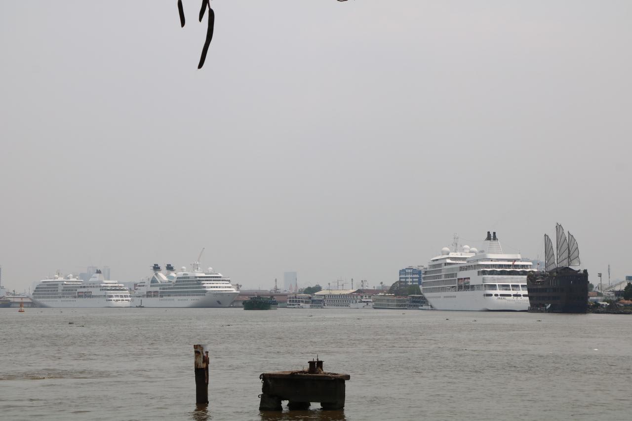 町をぶらりぶらりと歩いた後、先程見かけた白い客船を見るためにバイクがひしめき合って走る道路を危険を冒して渡り、見晴らしの良い川岸に着きました。 何と白い客船が3隻も停泊しているではありませんか!あいにく双眼鏡を持って出掛けなかったので、3隻共に船名を判読できず残念。サイゴン川を河口から上ってくることが出来る通称スモールシップの2万トン級の客船でした。こうやって初めて見る客船をボーと眺めているだけで幸せな気分になります。