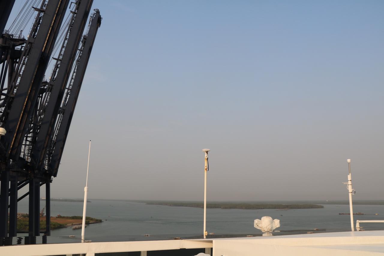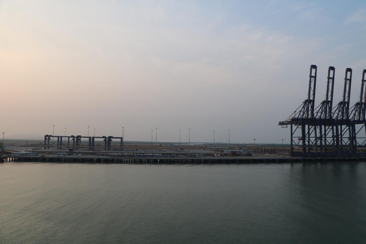 キリンのような大型クレーン以外は何もないプーミー港に間もなく接岸