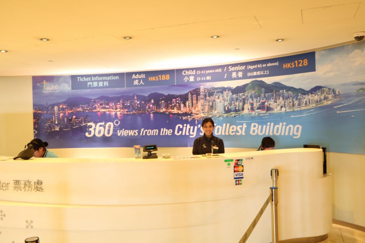 香港で最も高い超高層ビルの世界貿易センター100階にあるスカイ100香港展望台(海抜393m)を訪れました。SKY100の切符売り場入場料金はシニア割引してもらい128HK$(約2,000円)