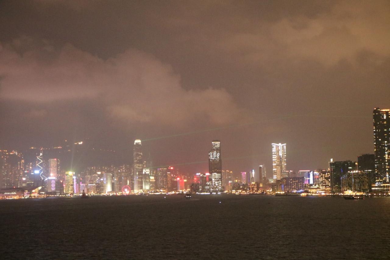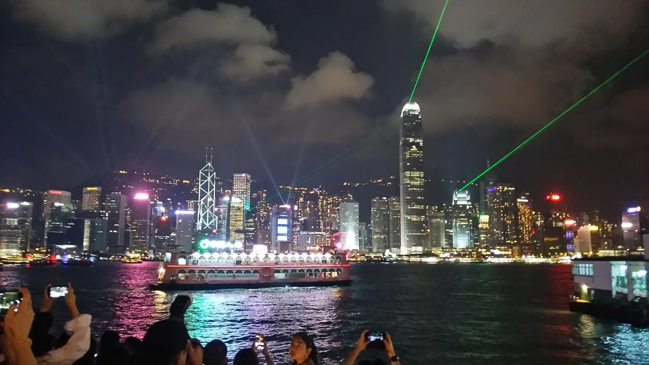 船上から見たシンフォニー・オブ・ライツ昼間の観光で疲れ果ててしまい、暗くなってから尖沙咀方面に再度出かけるのをサボってしまいあとで後悔。デッキが明る過ぎてこんな感じの写真しか撮れませんでした。