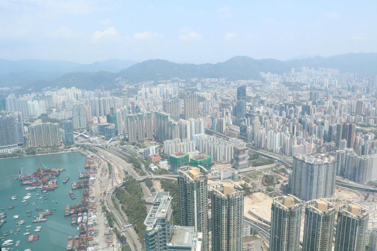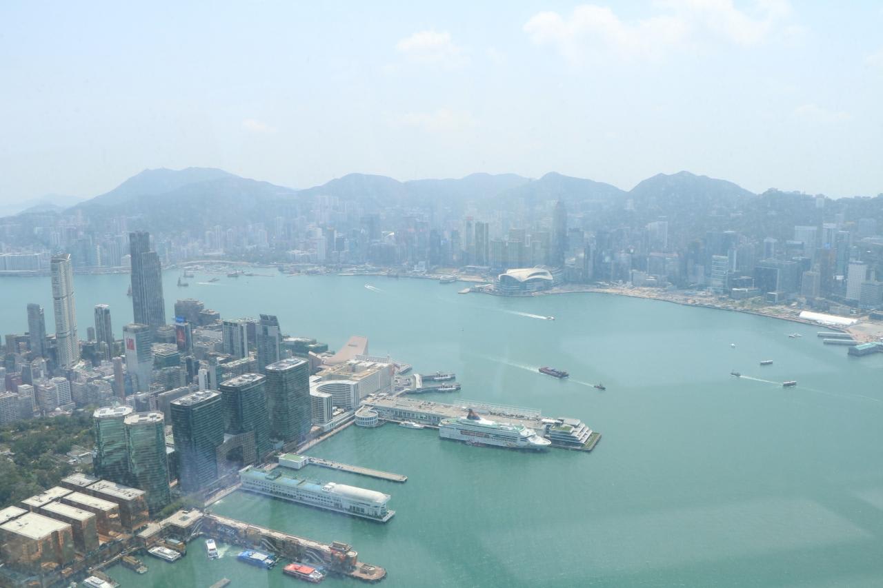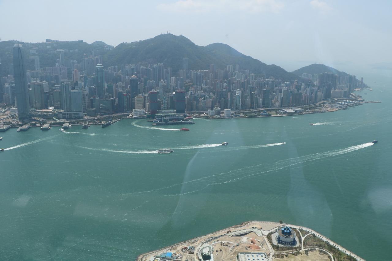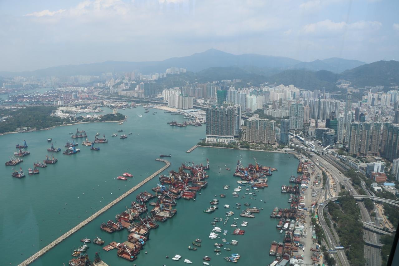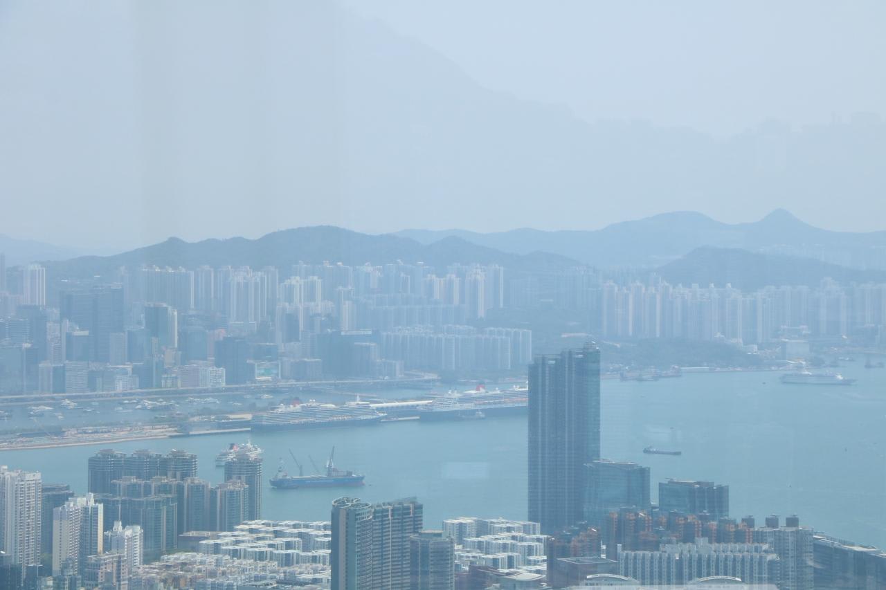 香港一帯とビクトリア・ハーバーのパノラマビューを360度見渡すことができました。屋内展望台から見た東側の景色