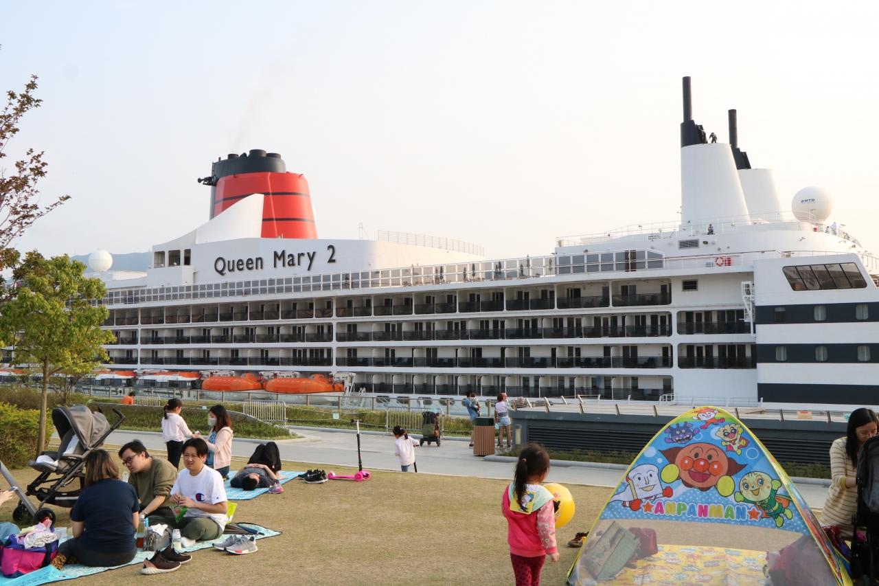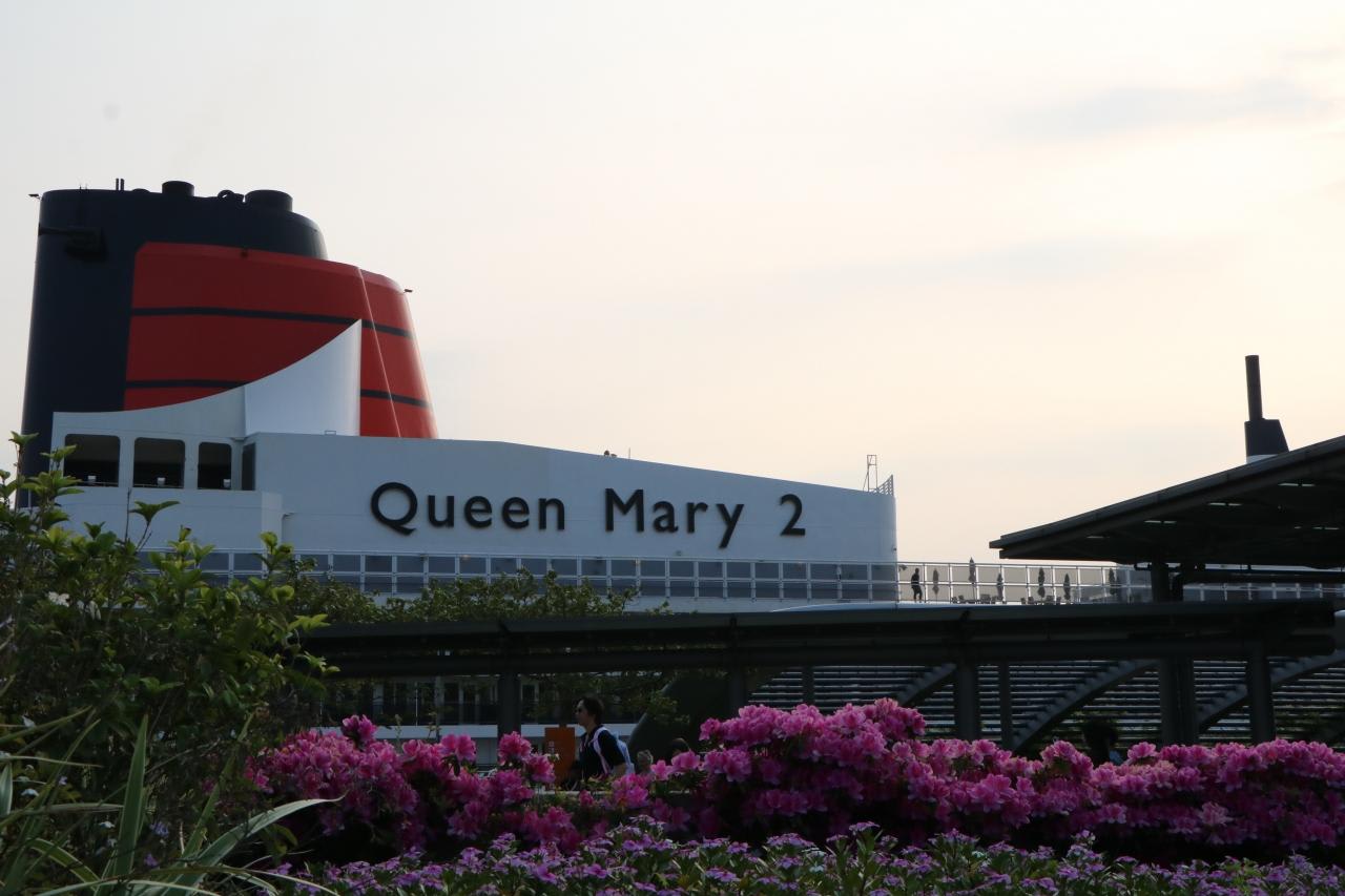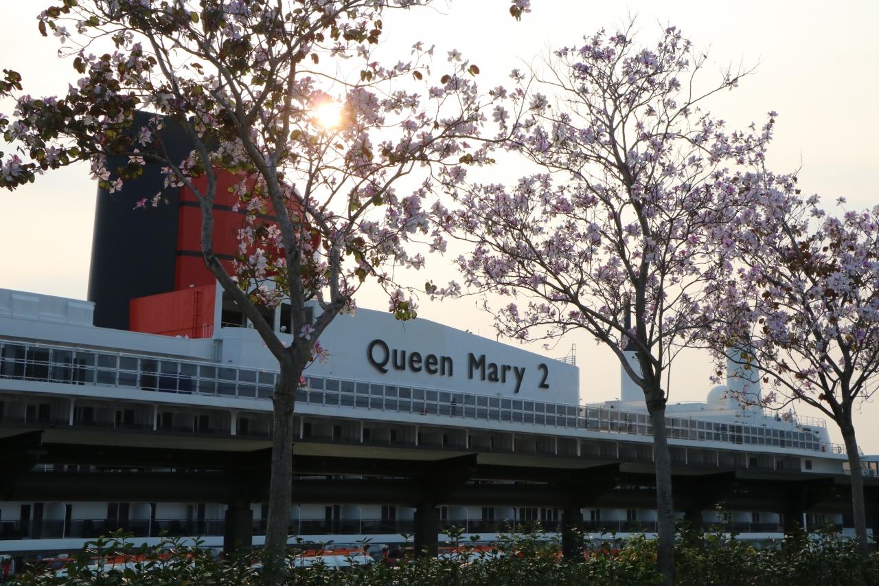 サクラの花も咲いており、クイーンメリー2が日本の港に停泊しているみたい。