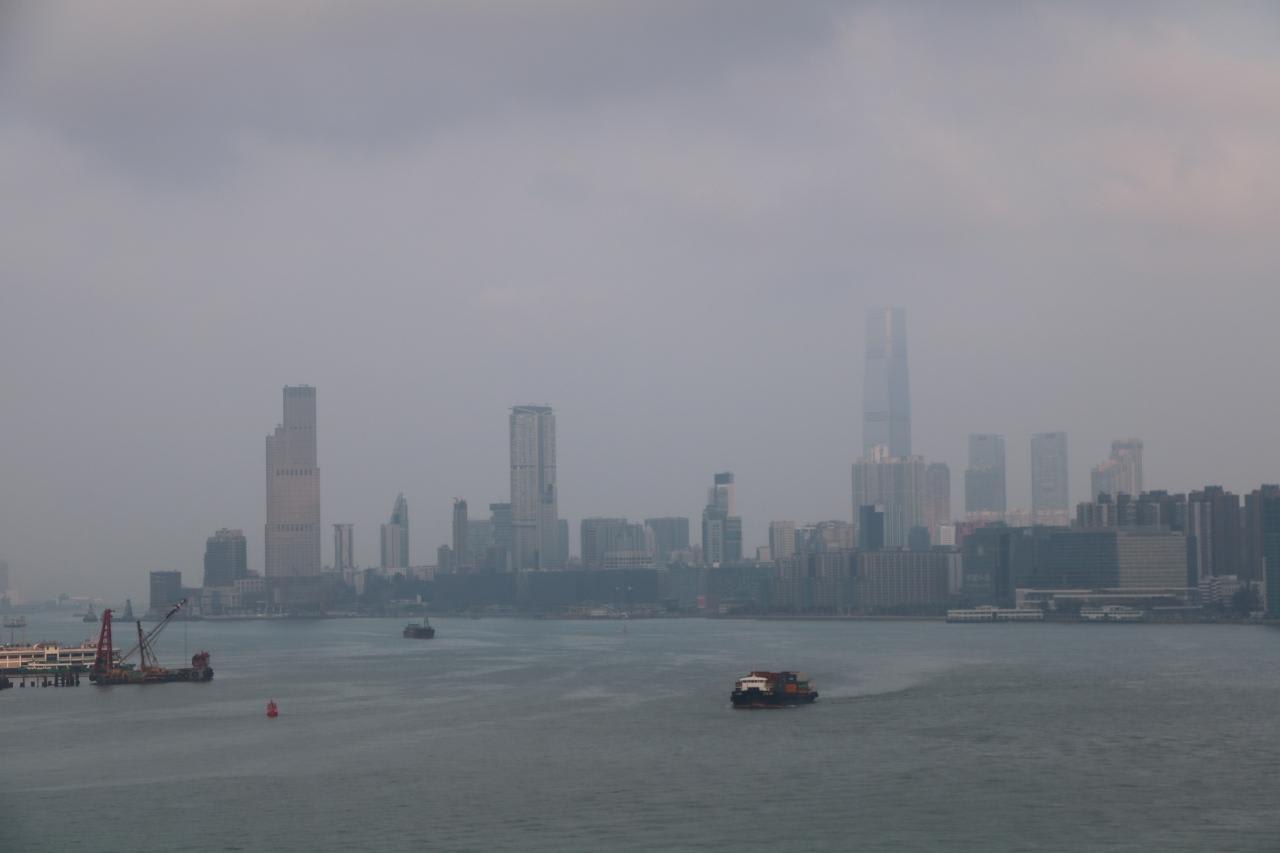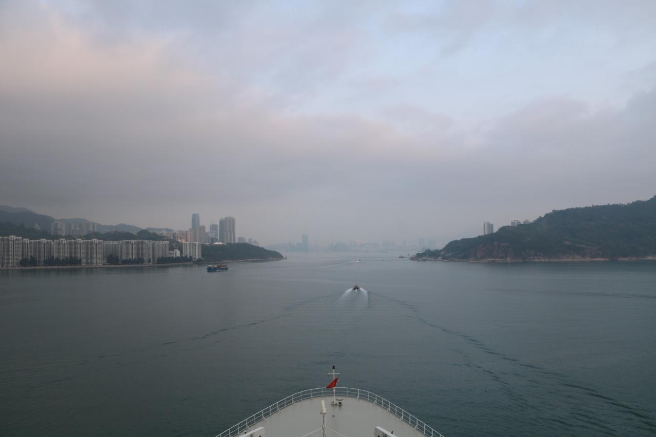 午前7時頃デッキ11の船首に行くと香港の高層ビル群が見えてきました。