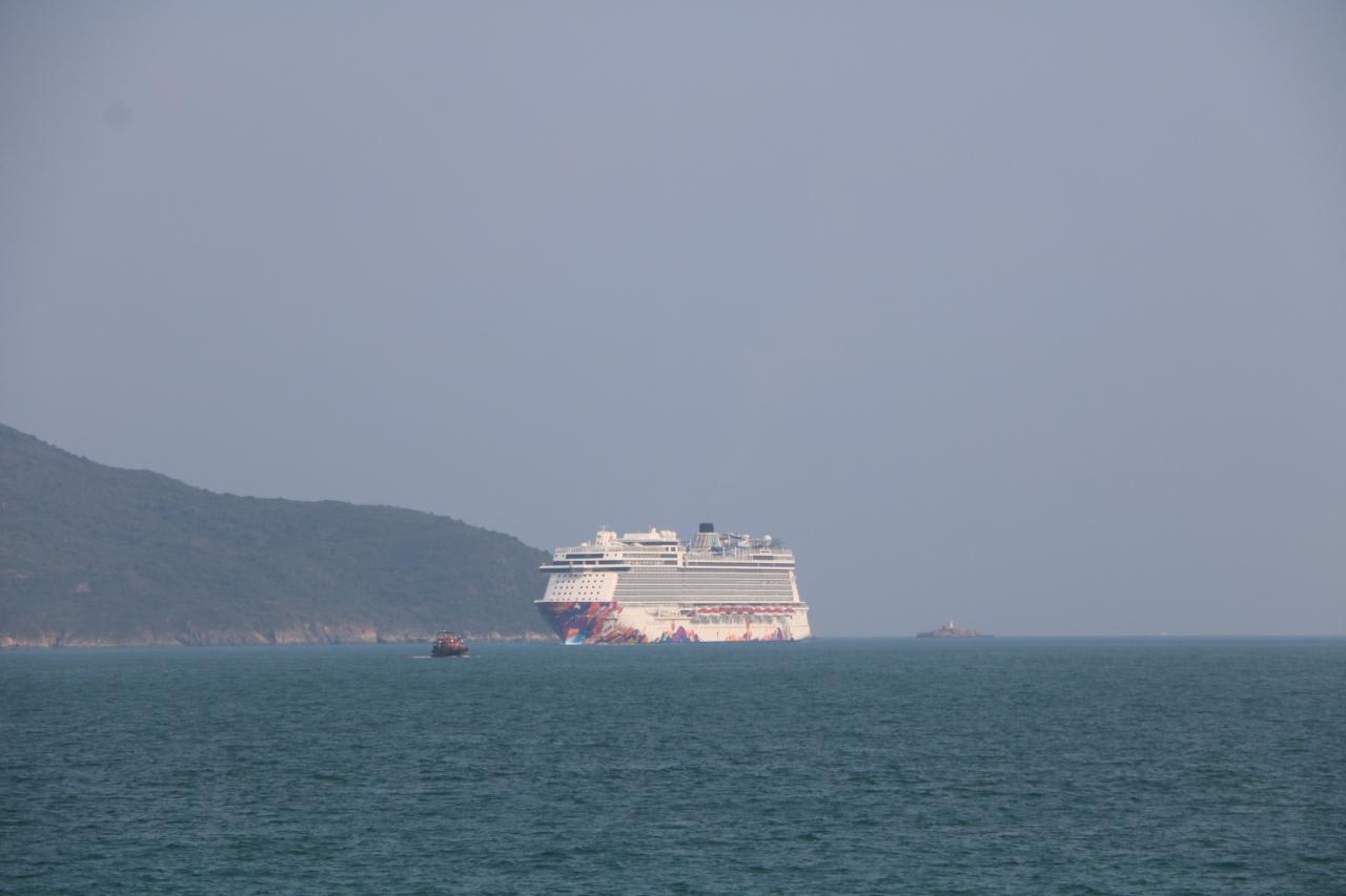 香港発着クルーズを定期運航しているワールドドリームが入港して来ました。肉眼では船名が読み取れませんが、特徴あるハルペイントで判明。シンガポールで見たゲンティングドリームの姉妹船で昨年就航したばかりの新造船です。<ワールドドリームのシップデータ>総トン数150,695トン、全長335m、全幅40m、乗客定員3,376人、就航2017年11月、建造マイヤー造船所・ヴェルフト社(ドイツ)