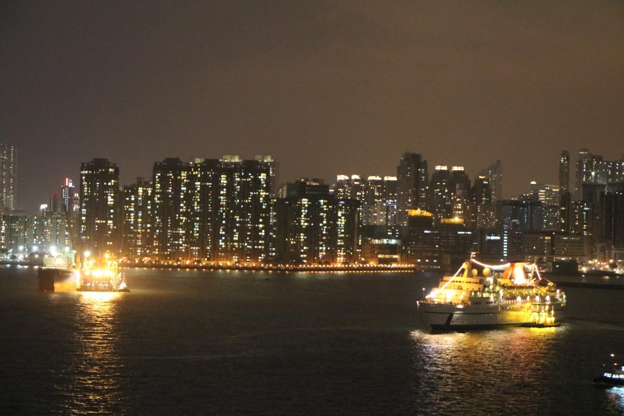 クイーンメリー2のデッキから見た香港の夜景右側の船はオリエンタルドラゴン