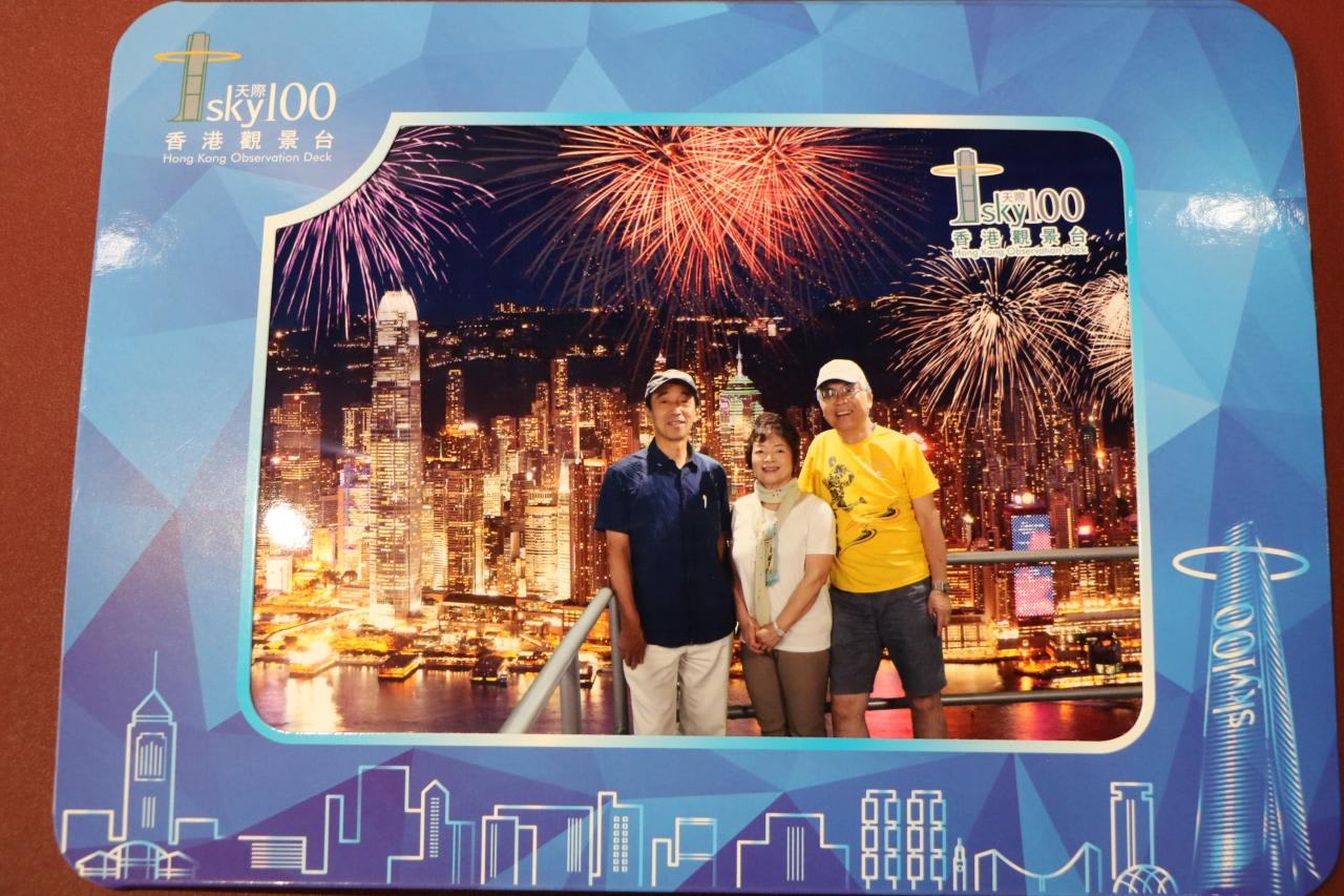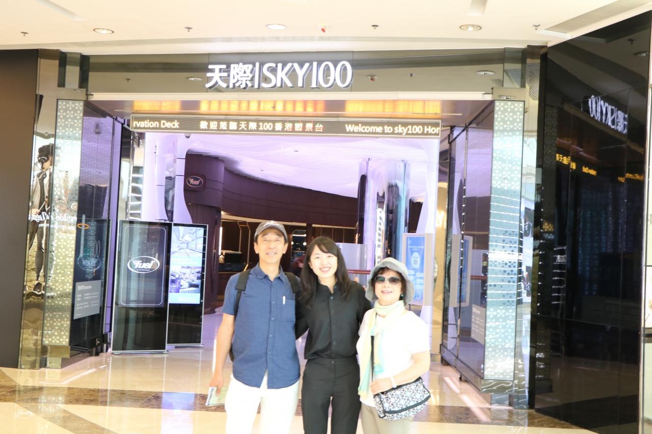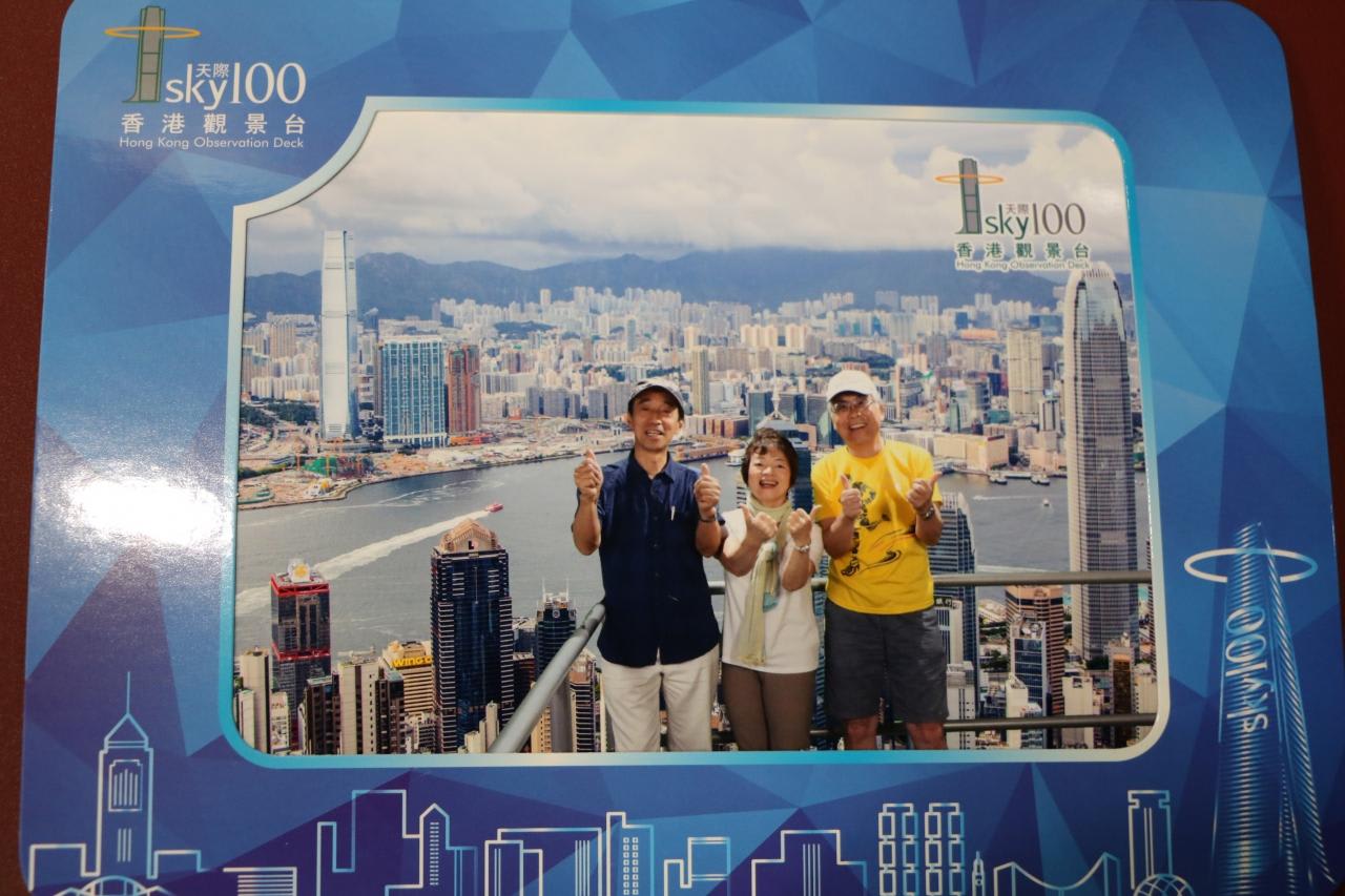 スターフェリーで香港島を往復し、尖沙咀に戻ってから香港で一番高いSKY100(天際100)へ。SKY100のエレベーター乗り場を探しても見当たらず迷っていたら親切な香港女性が付き添って100m位一緒に歩いて案内してくれました。お礼の印に記念写真も。