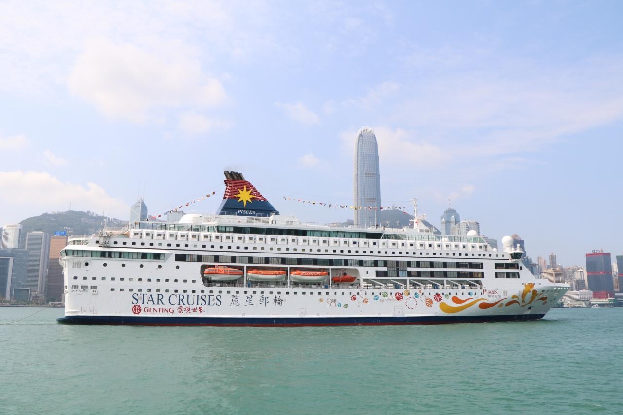 香港発着クルーズをしているスター・パイシスが目の前に現れ、オーシャンターミナルに入港。<スター・パイシスのシップデータ>総トン数40,053トン、全長177m、全幅29m、乗客定員1,009人、建造1991年フィンランド