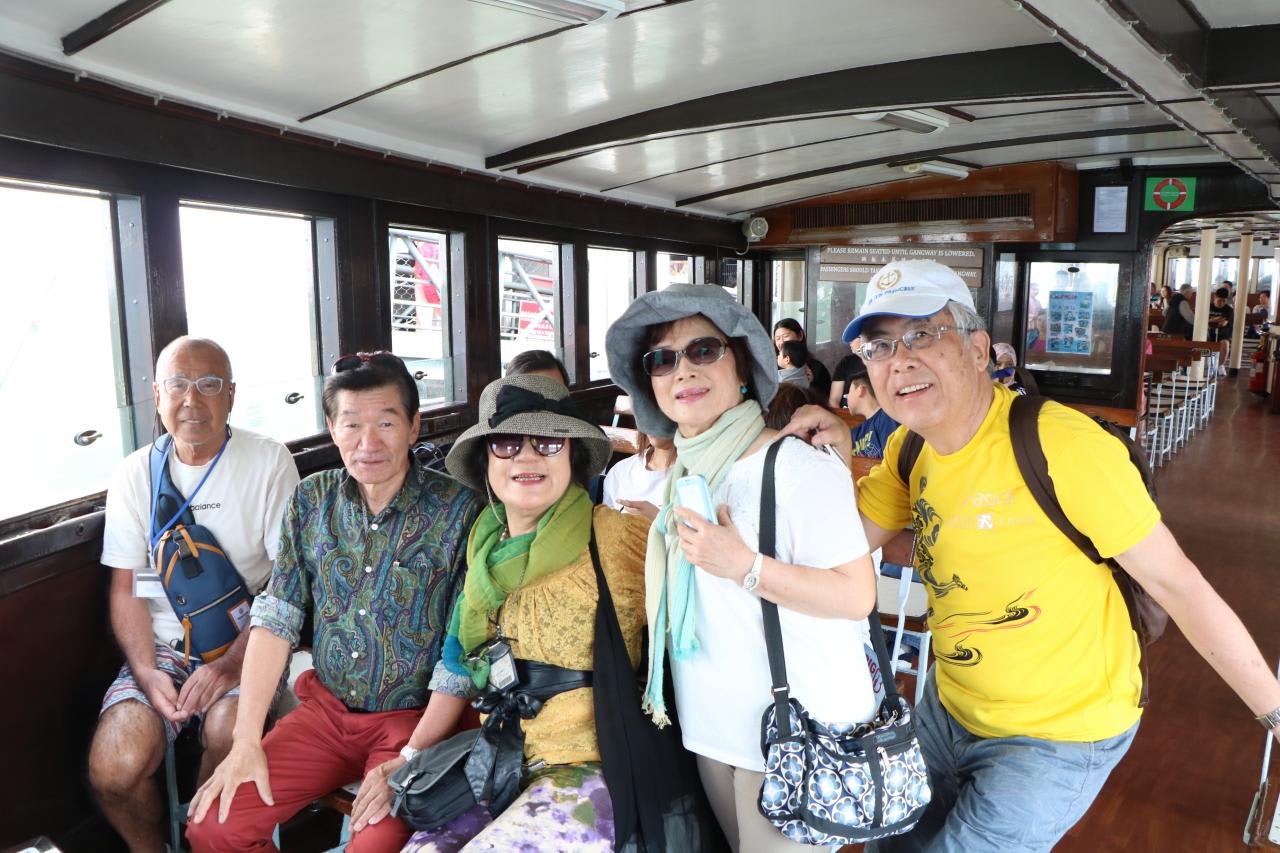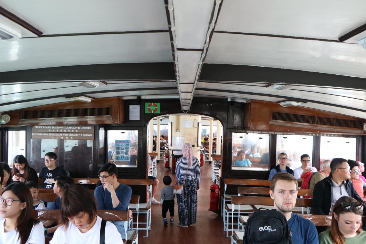10分間隔で運航され、運賃が安くて便利なスター・フェリーの船内風景地元の人や各国の観光客が自由気ままに乗船しています。
