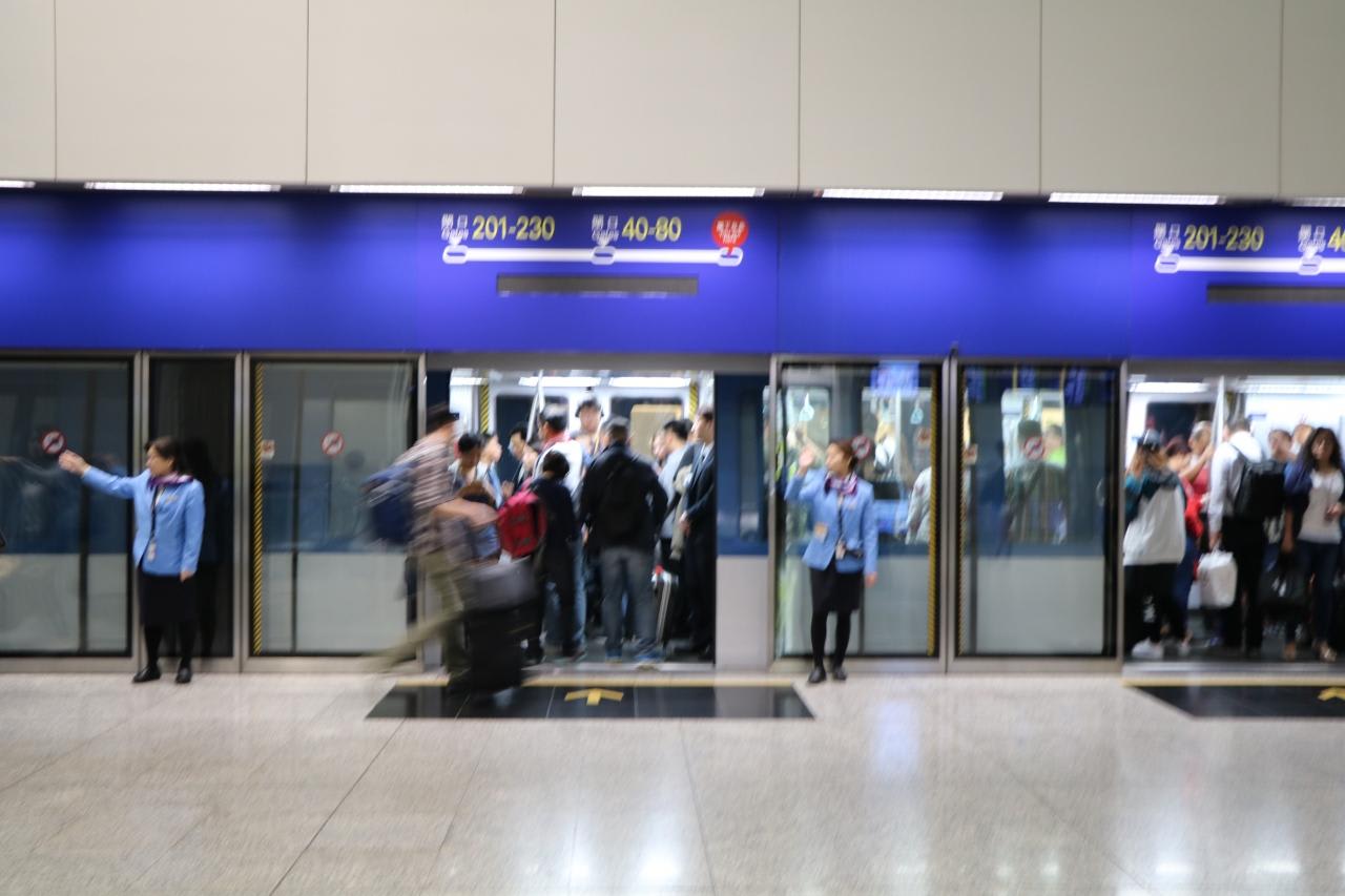 第2ターミナルで出国審査や保安検査場を抜けた後、エスカレーターに乗ったり歩いたり。かなりの距離を歩き、連絡シャトル電車に乗り搭乗ゲートへ