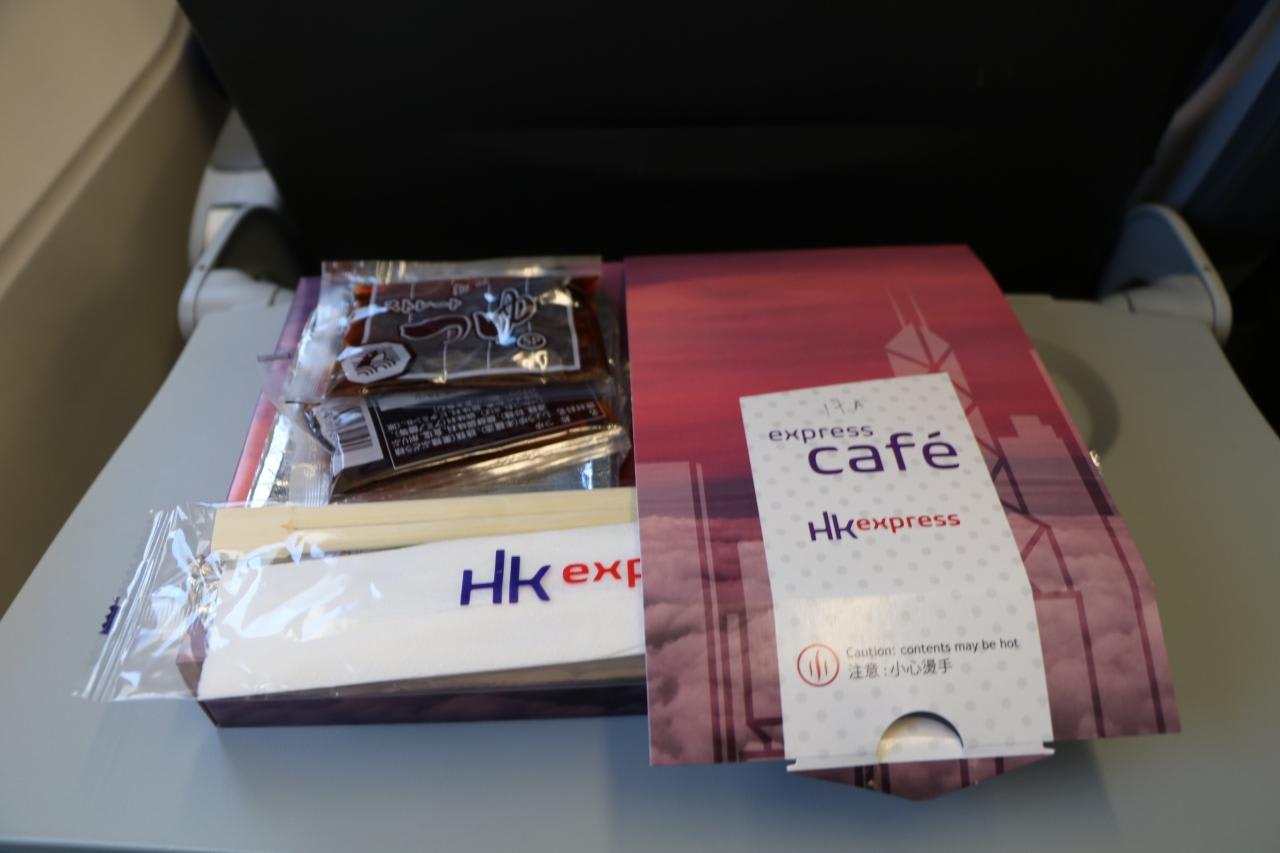 事前予約しておいた「和風お蕎麦弁当」。中味は大したことはなく料金は105HKD(約1,500円)と高い感じがします。インターネット予約者にはミネラルウォーターがサービス。食べる時は狭くて窮屈ですが、LCCだから我慢我慢!隣りの人はカップラーメンを食べていました。